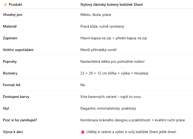 Stylový dámský kožený batůžek Shani je přesně ten typ společníka, kterého chceš mít stále po ruce – do města, do školy i do práce. Elegantní a přitom praktický kousek, který tě nezklame ani vzhledem, ani funkčností.