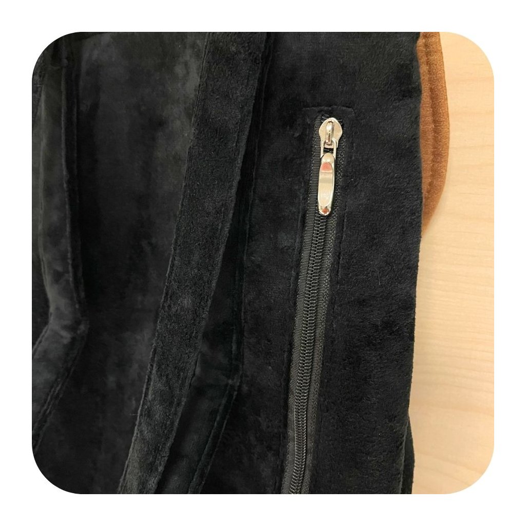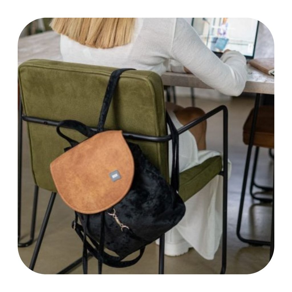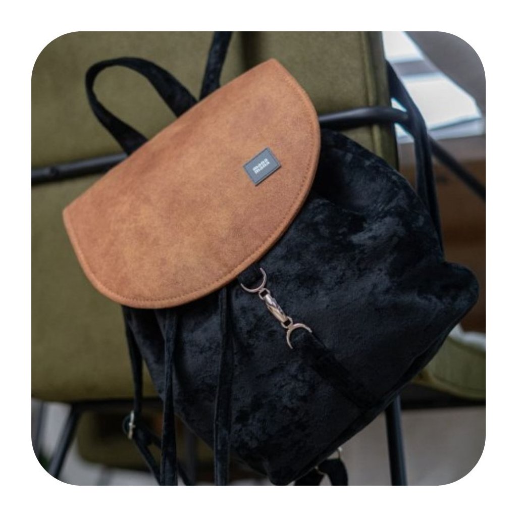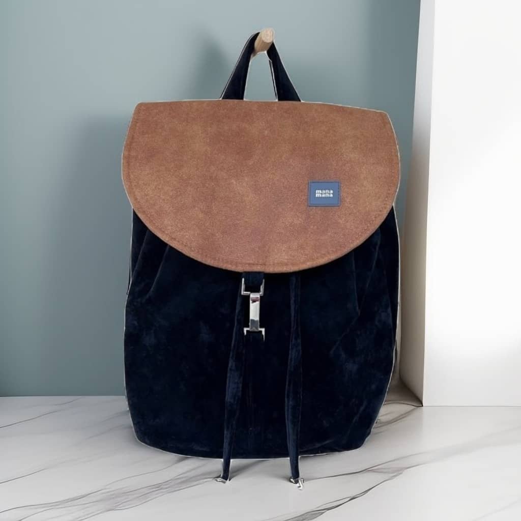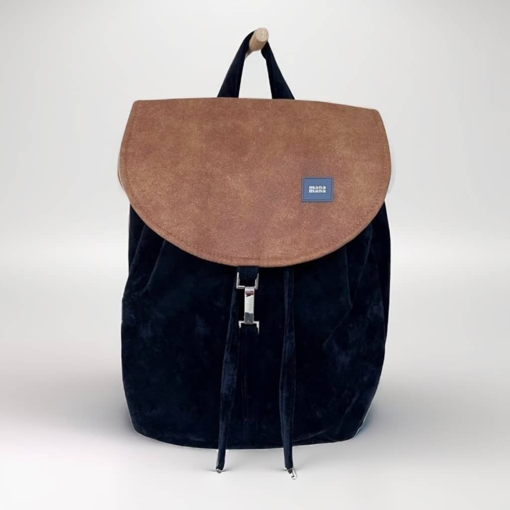 Batoh z eko semiše a odolné ekokůže/hrubé tkaniny. Uvnitř je silná bavlněná podšívka, a kapsičky pro snadné řešení ukládání věcí. Maximální zátěž je 4 kila. Zapínání batohu je na karabinu.