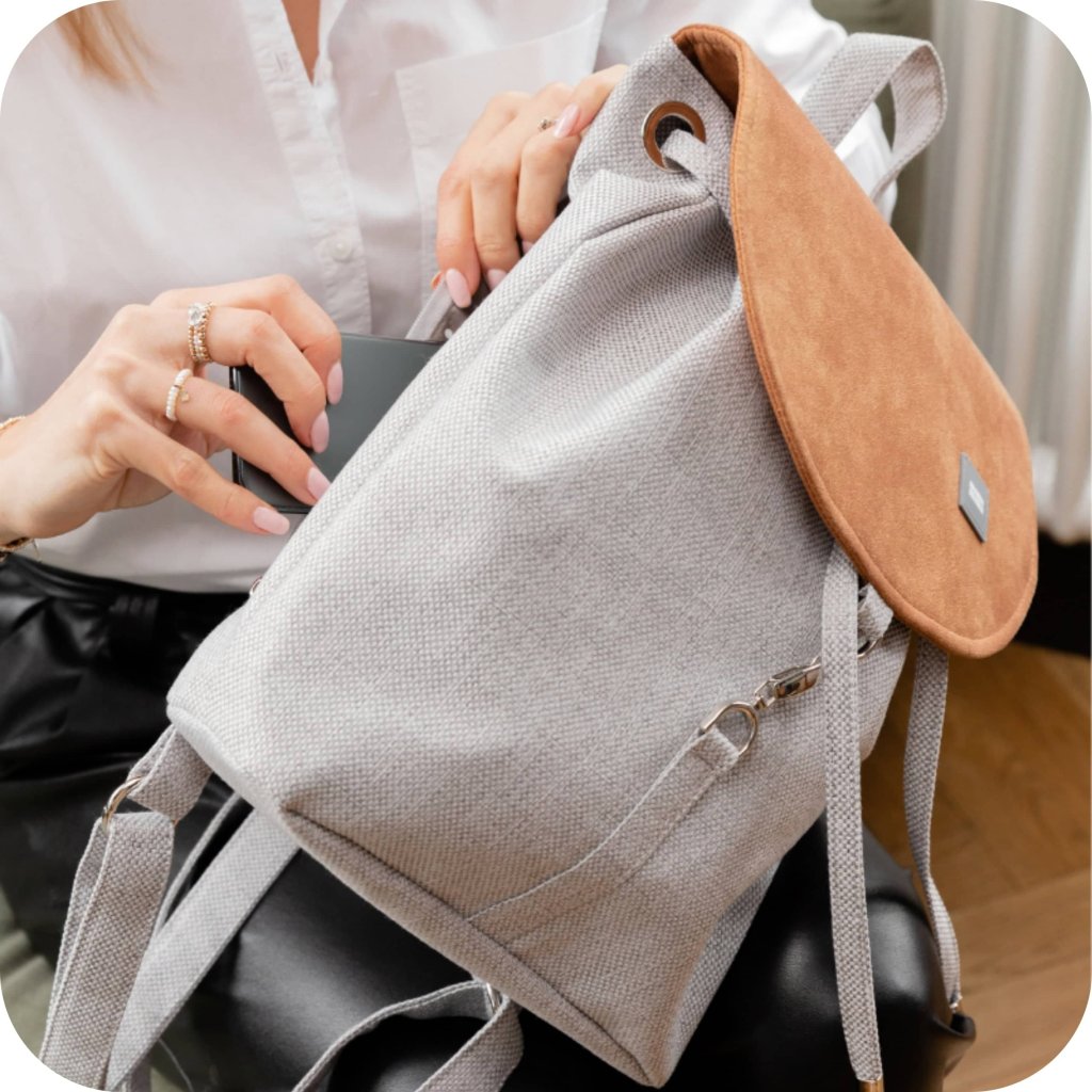 Batoh z hrubé tkaniny v šedobílé barvě s klopou v hnědé barvě. Uvnitř je silná bavlněná podšívka, a kapsičky pro snadné řešení ukládání věcí. Maximální zátěž je 4 kila. Zapínání batohu je na karabinu.