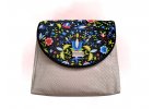 Ručně šitá kabelka značky Farbotka. Je jedinečná. Má patentované řešení vyměnitelných klopek. Zapínání klopek na 4 cvočky.