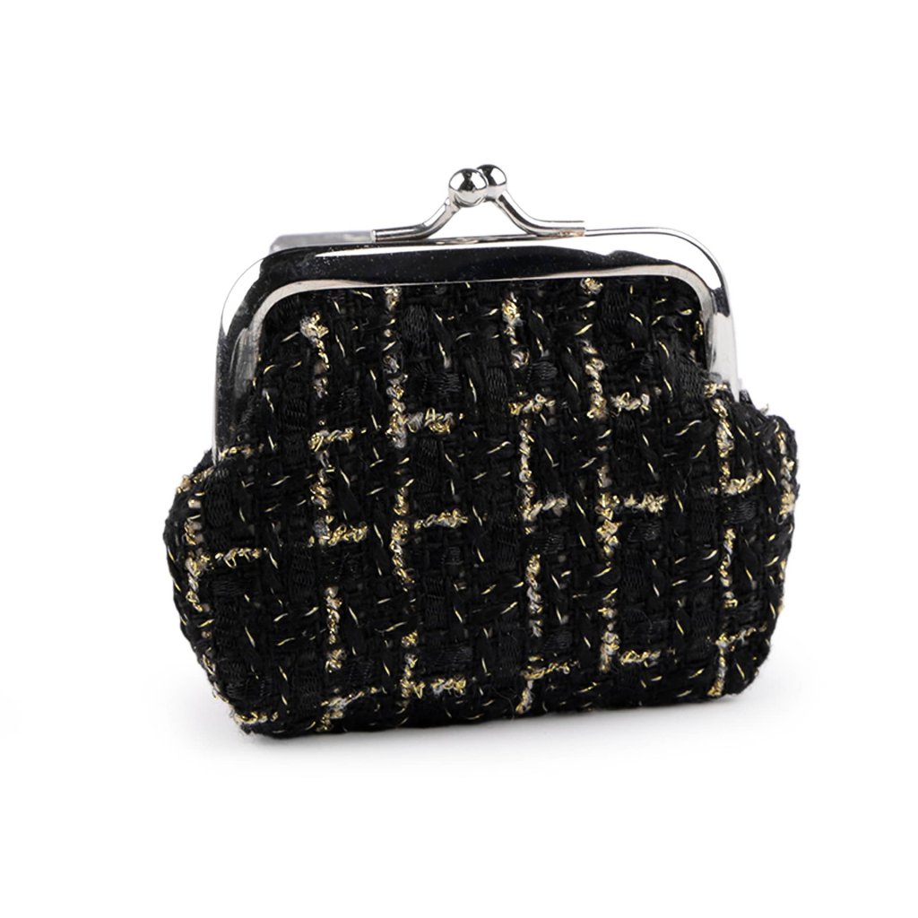 Atraktivní peněženka s lurexem ve stylu Chanel je malá, vhodná na drobné mince a klíče. Můžete do ní ukrýt také bankovky nebo dekorativní kosmetiku. Je lehká, textilní, nahoře zakončená kovovým rozevíracím rámečkem se zapínáním.