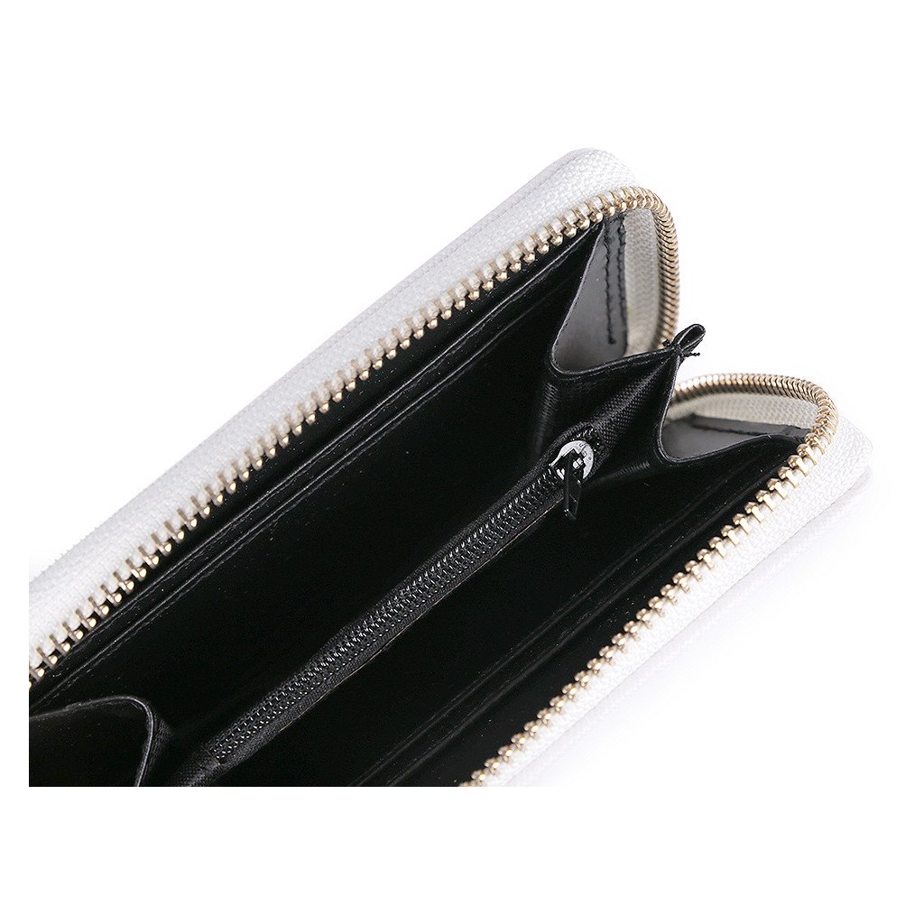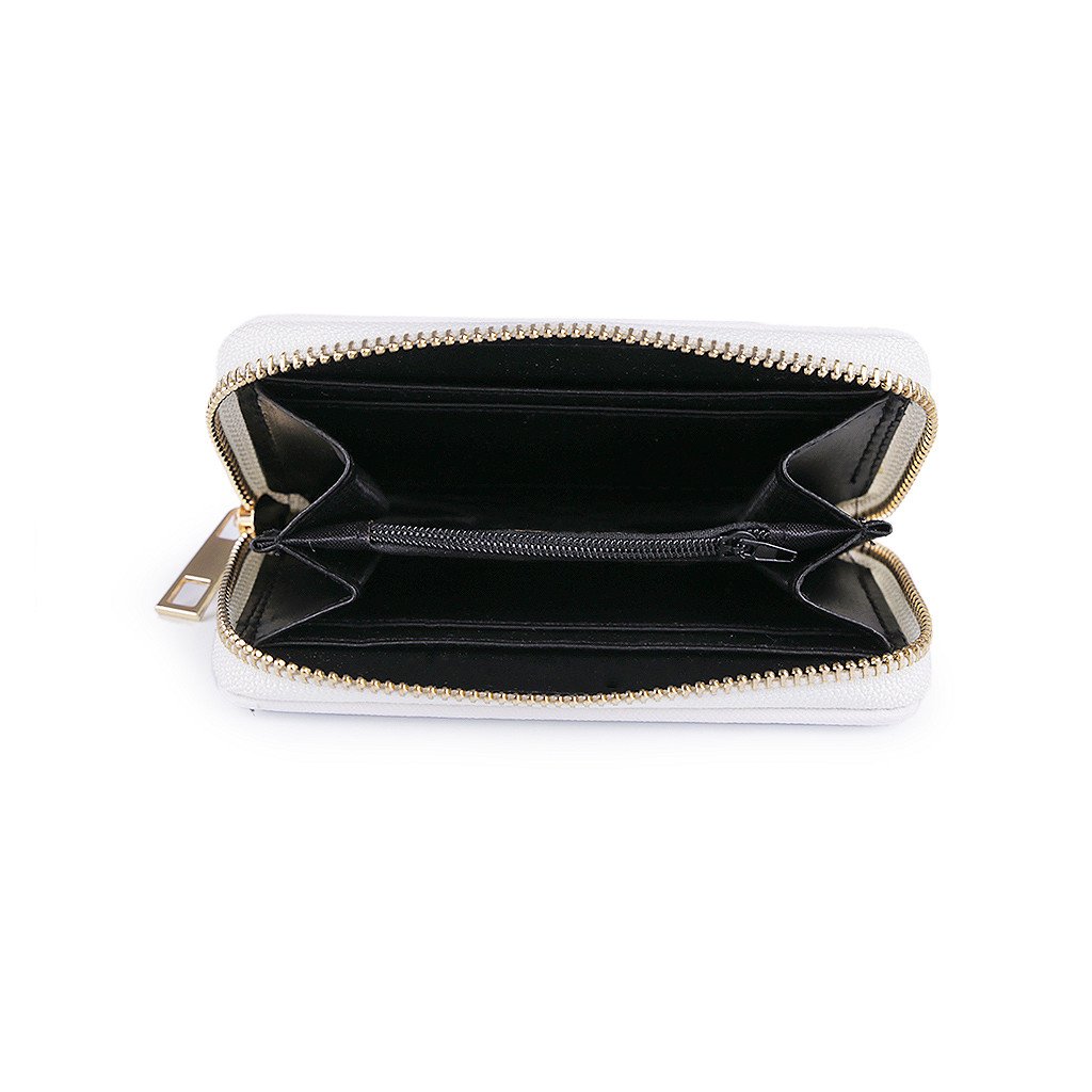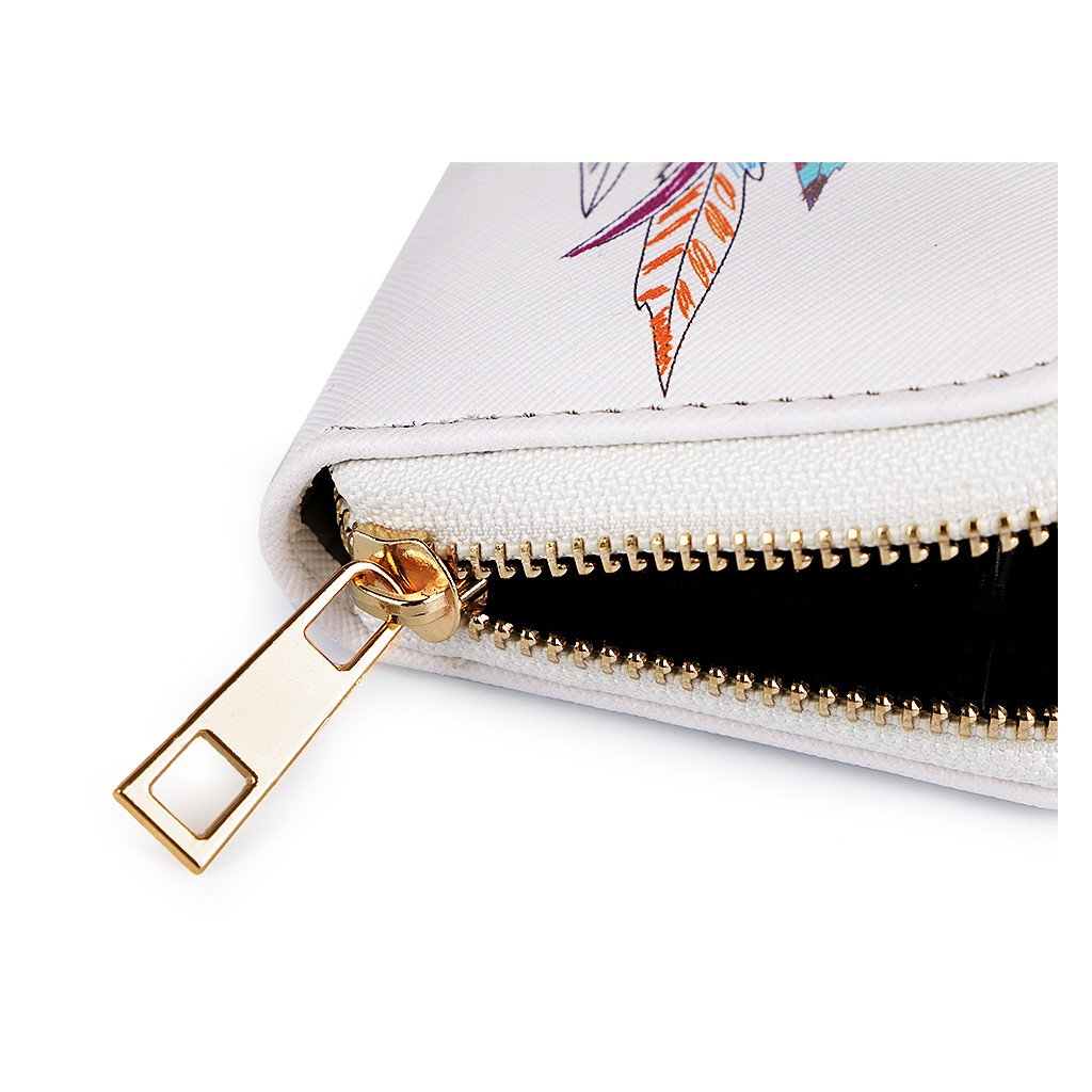 Peněženka má uvnitř, přesně uprostřed, jednu kapsu uzavíratelnou na zip na drobné mince. Po jejích bocích se nachází velké přihrádky na složené bankovky a přihrádky určené k uložení karet či dokladů.