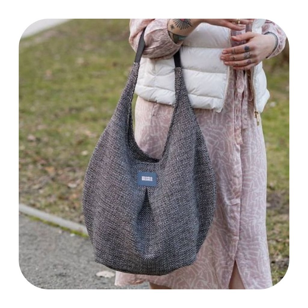 Elegantní taška z hrubé tkaniny. Uvnitř je silná bavlněná podšívka, a tři kapsy - dvě otevřené a jedna se uzavírá pomocí zipového uzávěru. Taška má pevný popruh - z eko kůže. Tvar kabelky v kapkovém designu. Je možné ji nosit volně přes rameno nebo v ruce.