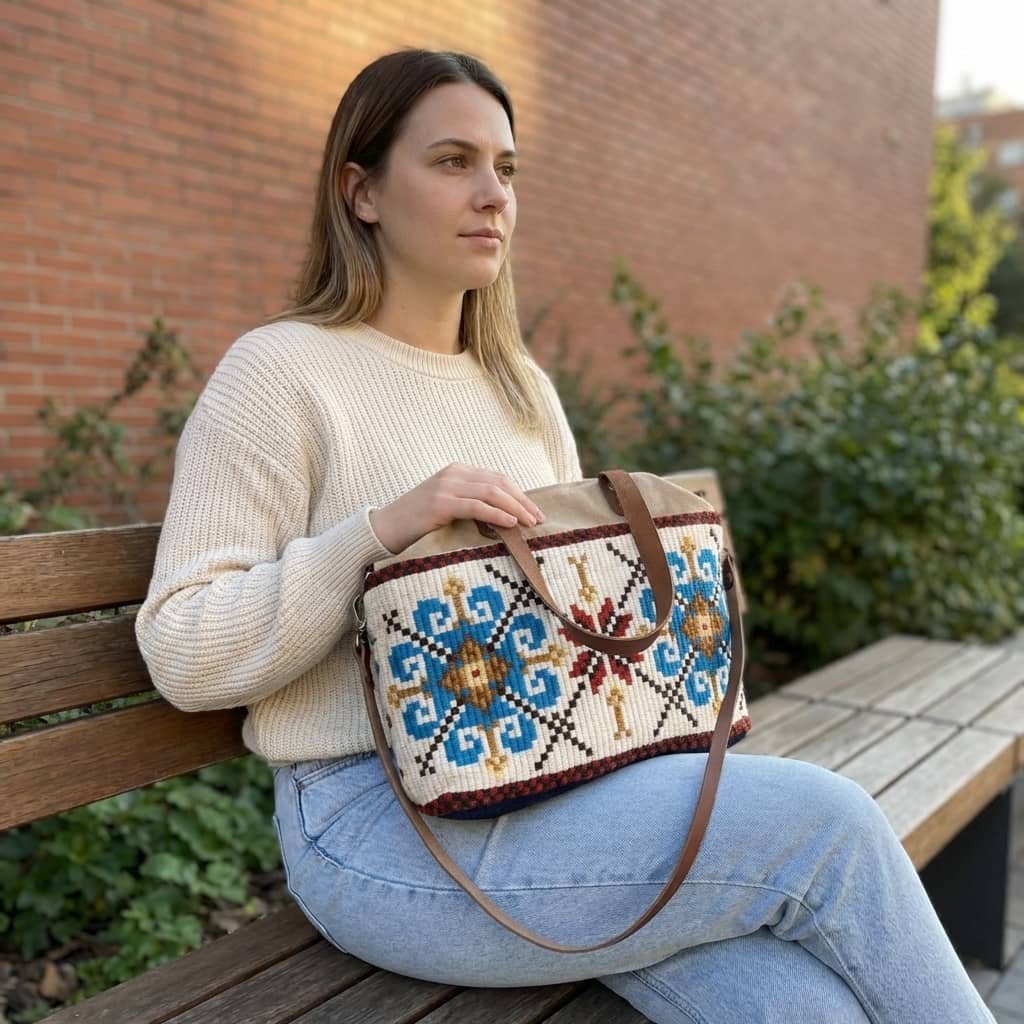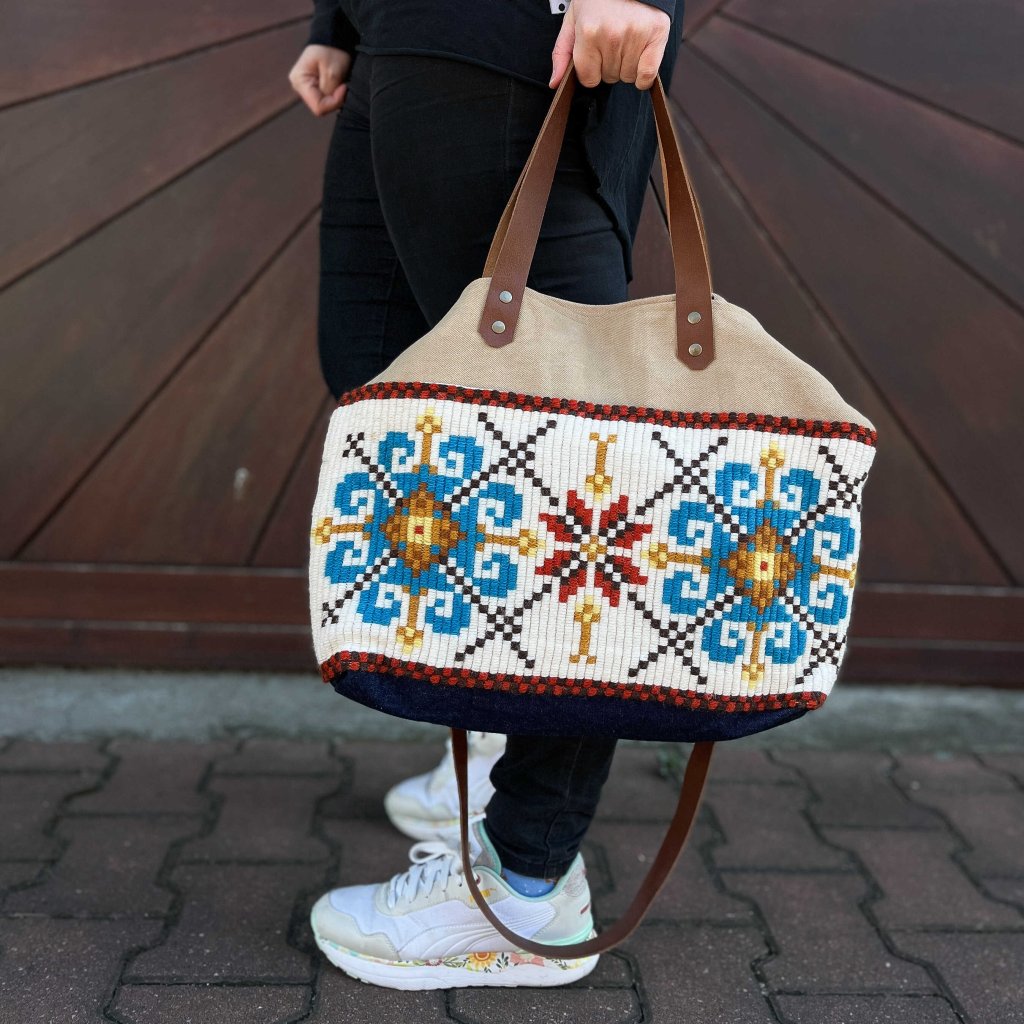 Ručně šitá kabelka z dílny designérky Anny Flis. Vyrobeno z hrubé tkaniny, džínoviny s koženými prvky.