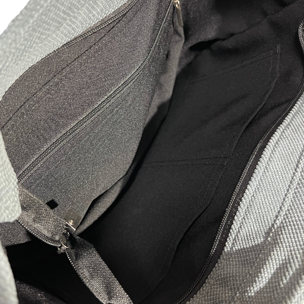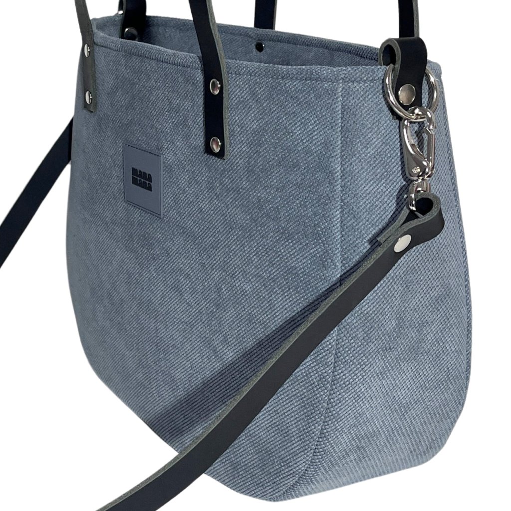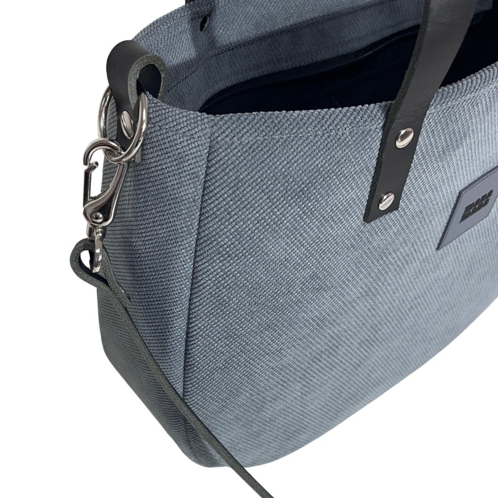 Velká taška z hrubé tkaniny. Uvnitř je silná bavlněná podšívka, a tři kapsy - dvě otevřené a jedna se uzavírá pomocí zipového uzávěru. Taška má pevný popruh z kůže a dvě uši z kůže . Je možné ji nosit volně přes rameno nebo upravit tašku pro nošení diagonálně (crossbody).
