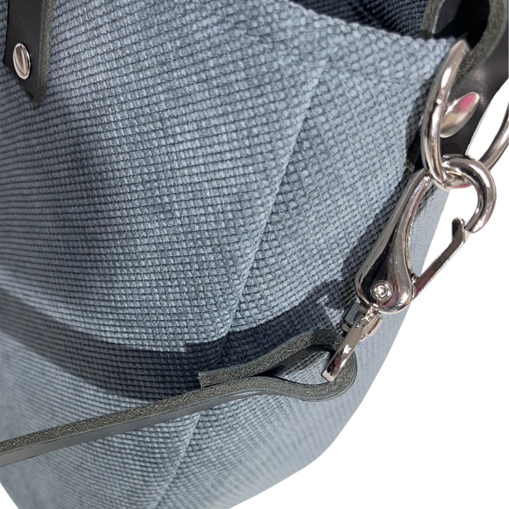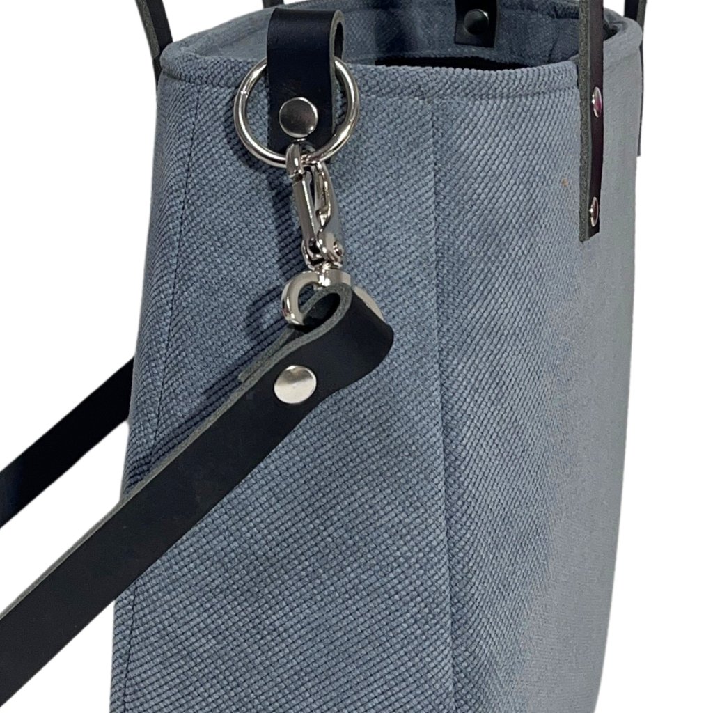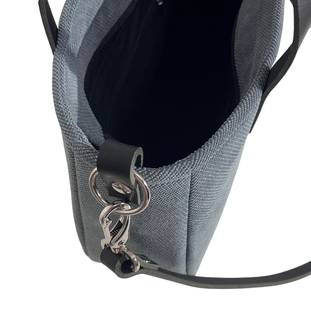 Velká taška z hrubé tkaniny. Uvnitř je silná bavlněná podšívka, a tři kapsy - dvě otevřené a jedna se uzavírá pomocí zipového uzávěru. Taška má pevný popruh z kůže a dvě uši z kůže . Je možné ji nosit volně přes rameno nebo upravit tašku pro nošení diagonálně (crossbody).
