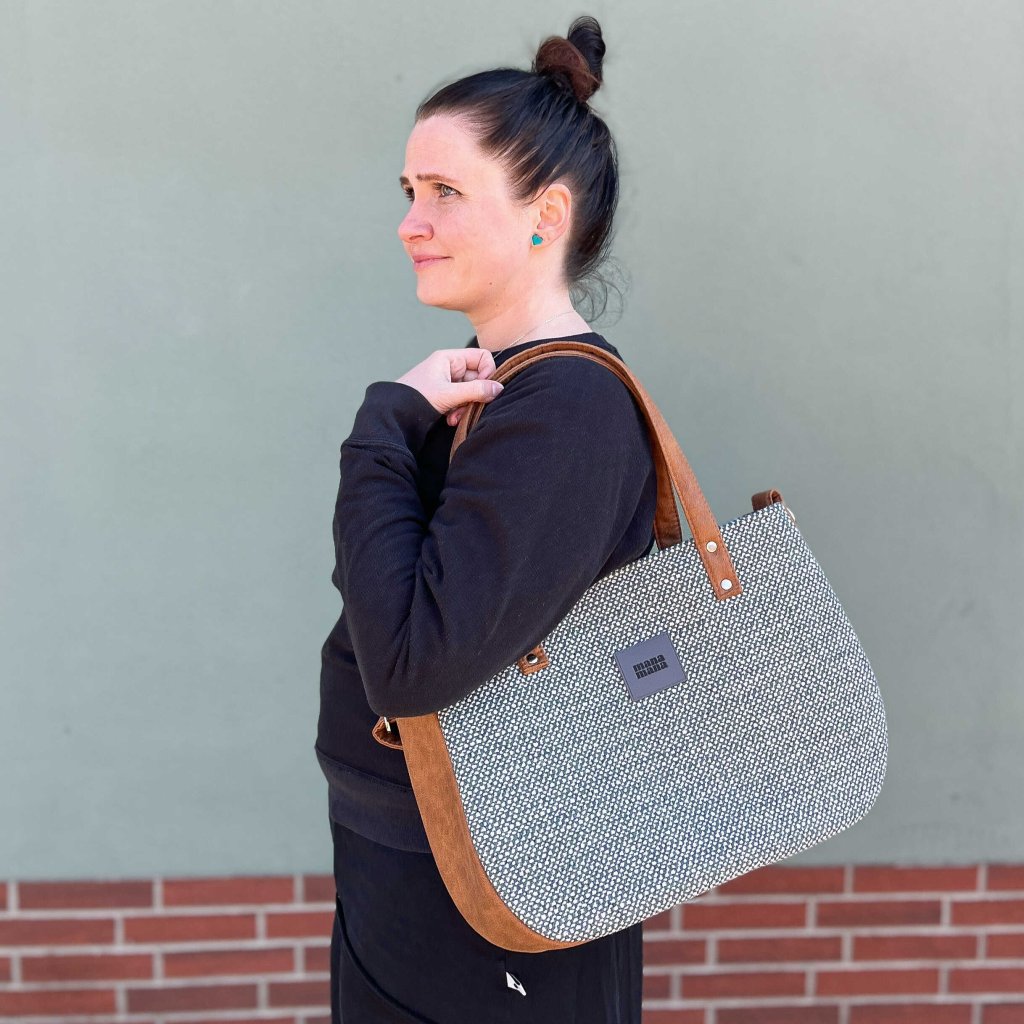 Velká kabelka z hrubé tkaniny. Tato kabelka pojme obrovské množství věcí, má zaoblené rohy. Uvnitř je silná bavlněná podšívka, a tři kapsy - dvě otevřené a jedna se uzavírá pomocí zipového uzávěru. Taška má robustní uši z eko semiše. Je možné ji nosit volně přes rameno nebo si nastavitelným popruhem ze stejného materiálu upravit tašku pro nošení diagonálně (crossbody).