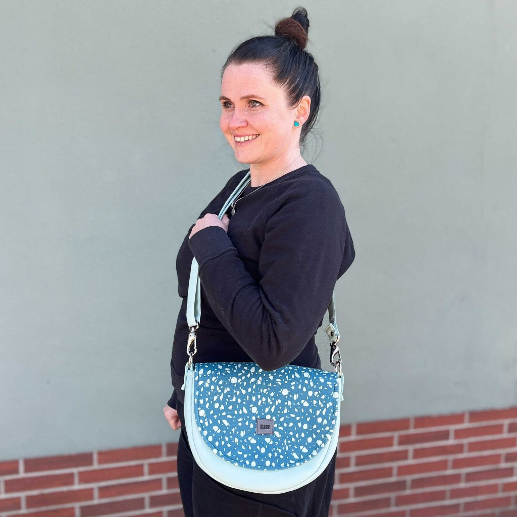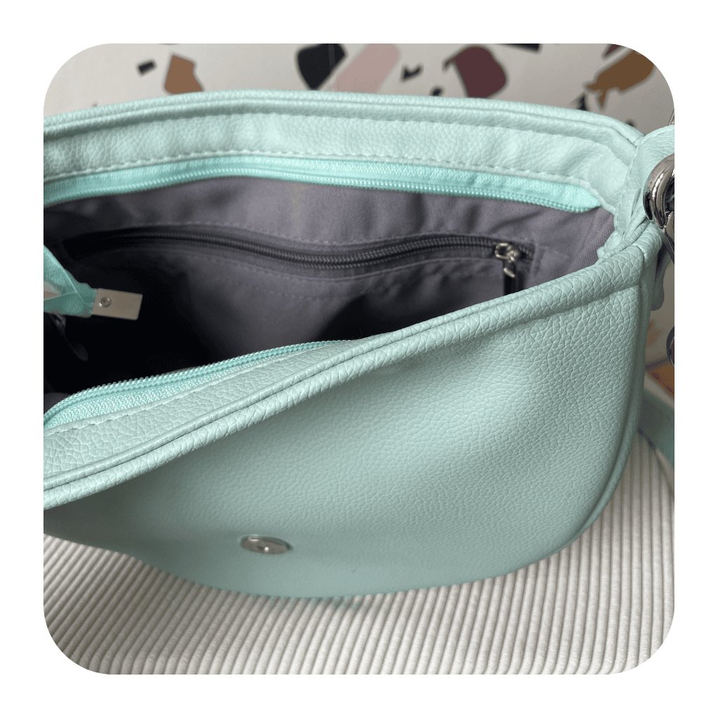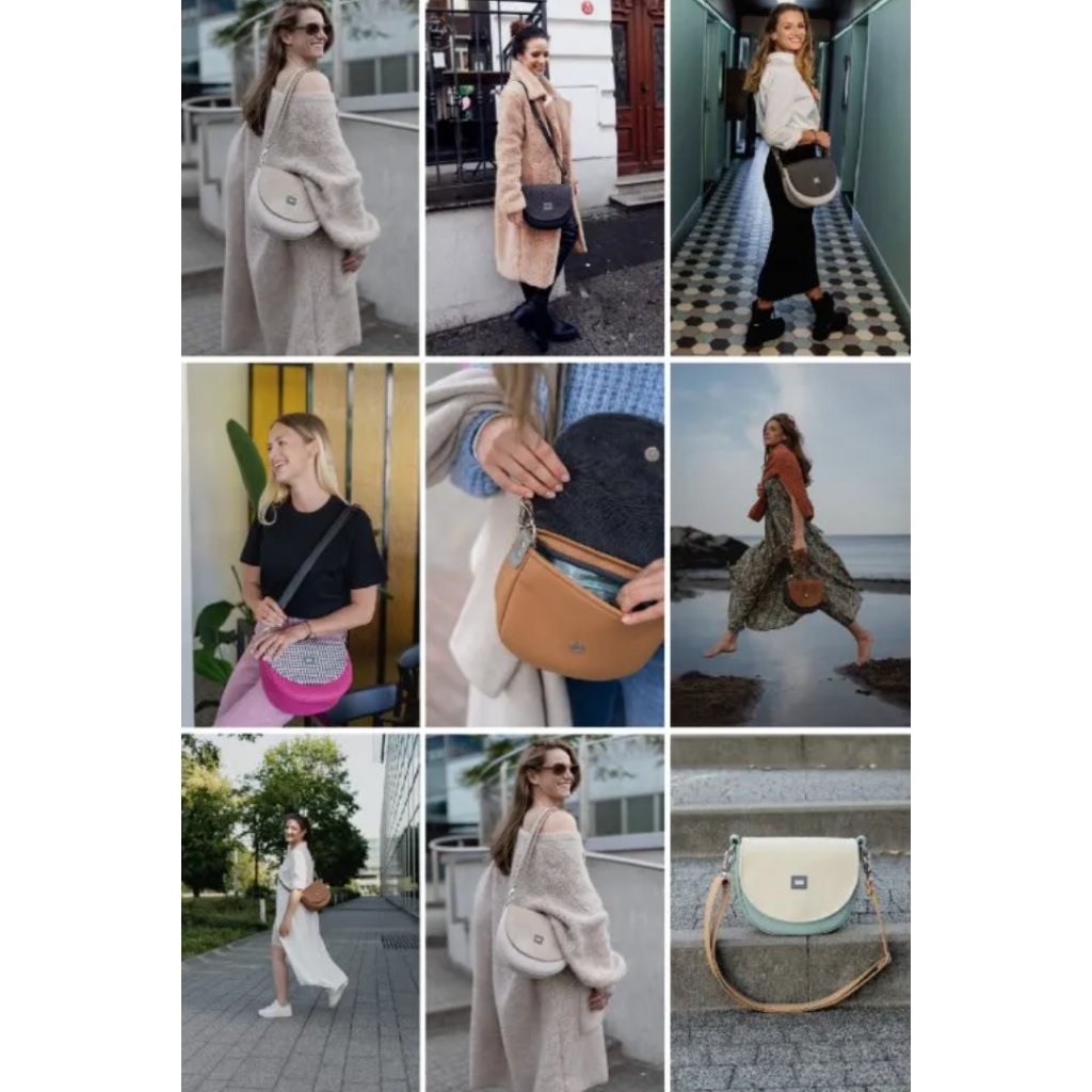 Malá praktická módní taška vyrobená z eko kůže/hrubé tkaniny. Uvnitř je silná bavlněná podšívka, uvnitř jedna kapsička na zip. Taška má pevný popruh, který je variabilní. Je možné ji nosit volně přes rameno nebo diagonálně.