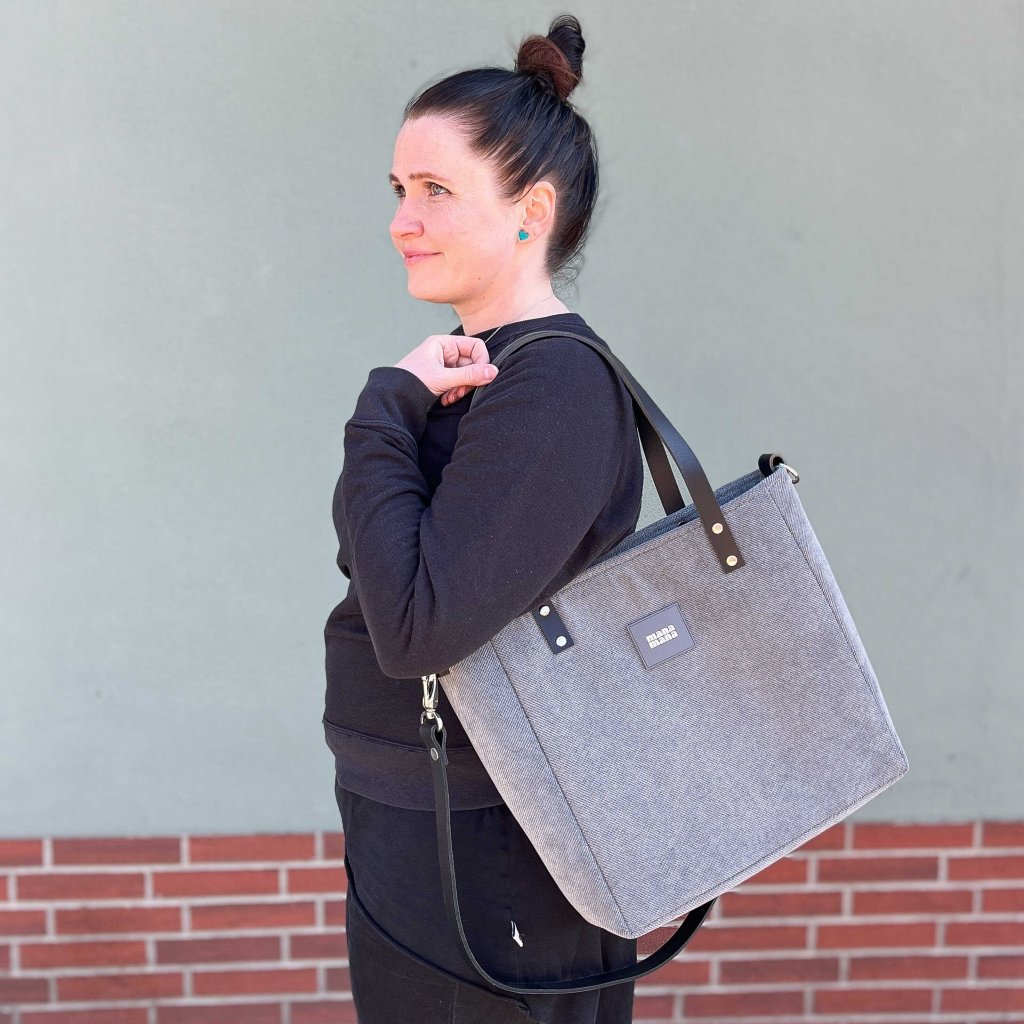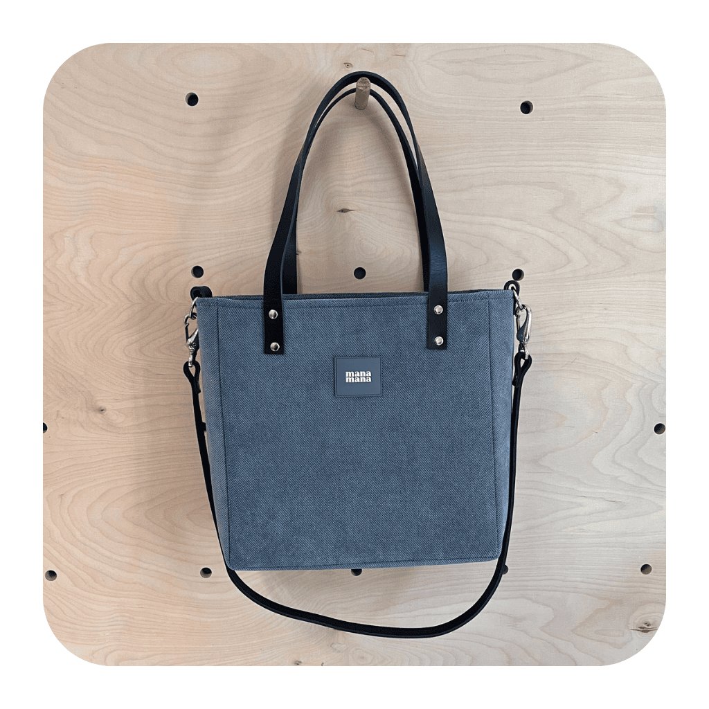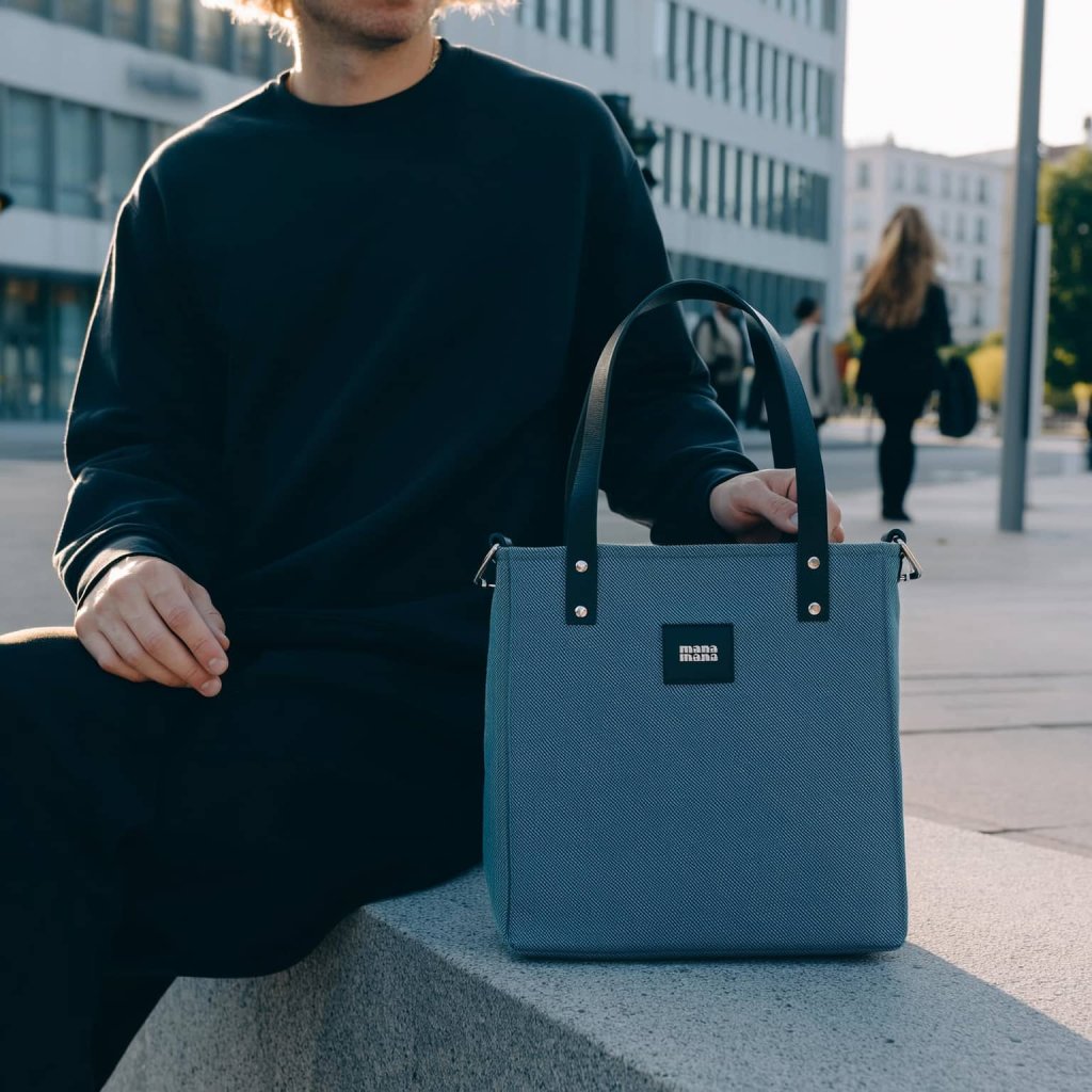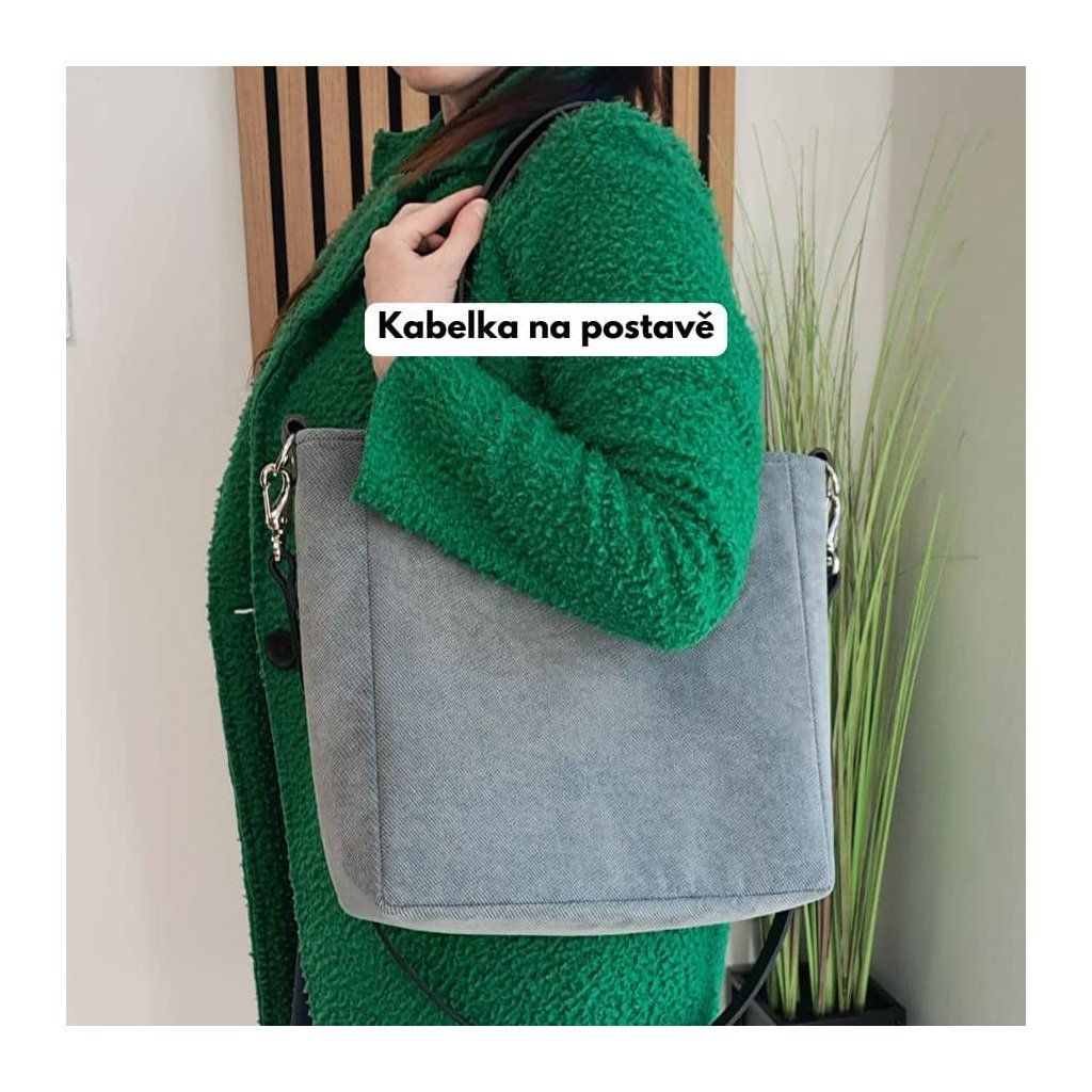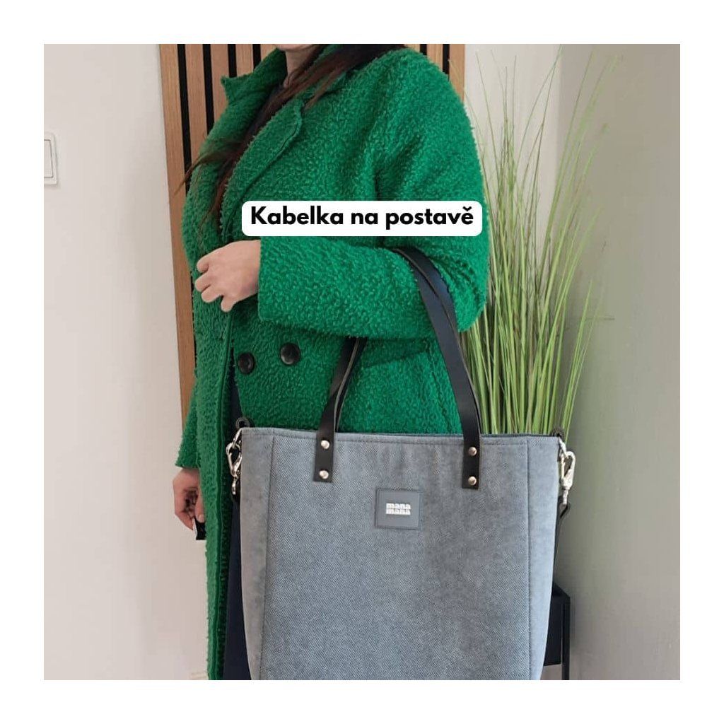Minimalistická módní kabelka vyrobená z hrubé tkaniny v barvě šedé. Uvnitř je silná bavlněná podšívka , a tři kapsy - dvě otevřené a jedna se uzavírá pomocí zipového uzávěru.