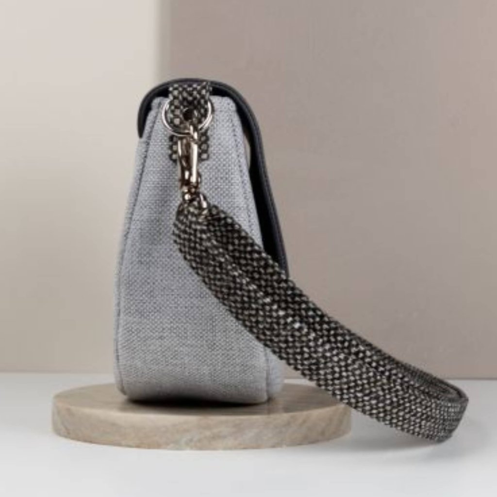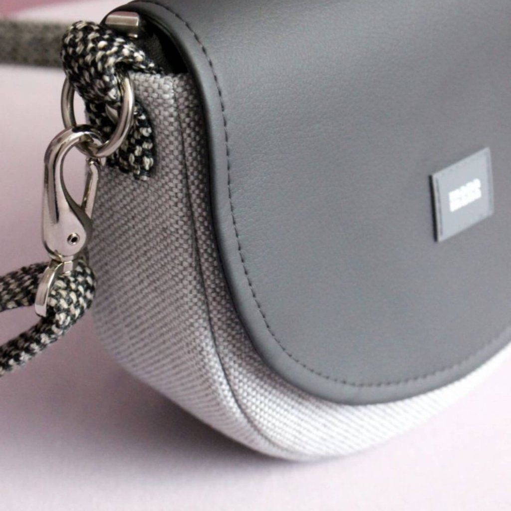 Malá praktická módní taška vyrobená z eko kůže/hrubé tkaniny. Uvnitř je silná bavlněná podšívka, uvnitř jedna kapsička na zip. Taška má pevný popruh, který je variabilní. Je možné ji nosit volně přes rameno nebo diagonálně.