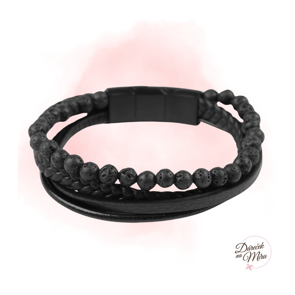 Náramek Kožený s korálky z lávy Unisex - Černý