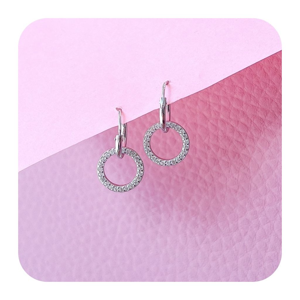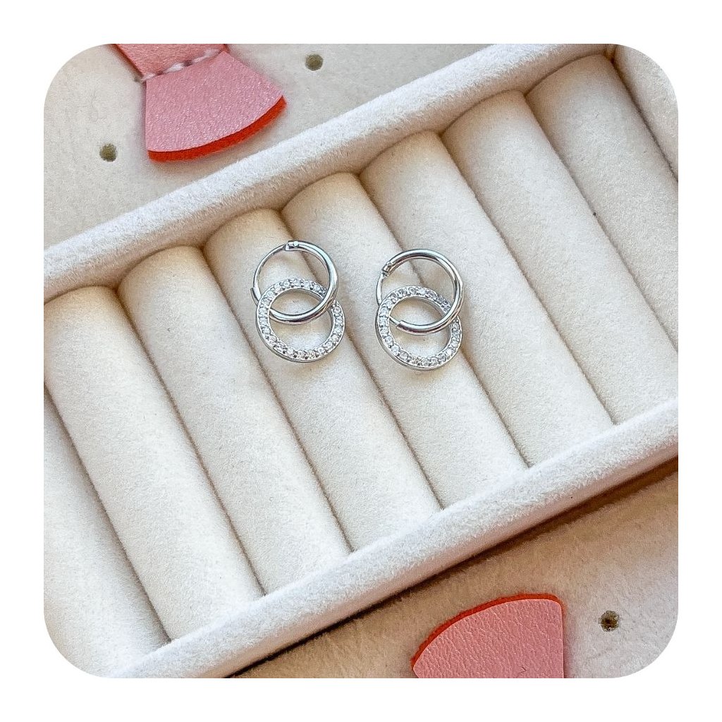 Elegantní stříbrné náušnice ve tvaru dvou kruhů zdobené zářivým zirkonem. Díky rhodiované úpravě si šperk zachovává svůj lesk a odolnost vůči poškození. S hmotností pouhých 1 g jsou lehké a pohodlné na nošení, ideální pro každodenní eleganci i speciální příležitosti.