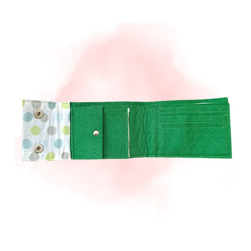 Ručně šitá peněženka s motivem teček. Designérka Marmollada. Místo na uložení bankovek, karet a mincí. Zavírá se na 2 cvoky.