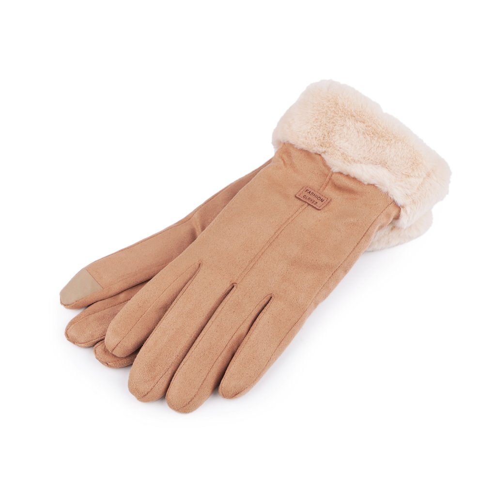 Elegantní dámské rukavice zdobí lem z umělé kožešiny a štítek s nápisem Fashion gloves. Rukavice jemně pruží, jejich povrch připomíná broušenou kůži. Uvnitř mají příjemný plyšový kožíšek. Hodí se do zimy i do chladnějšího podzimního počasí.