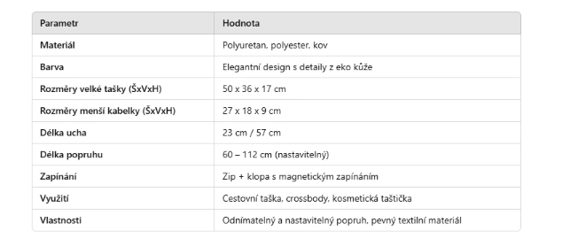 Elegantní modrý design s detaily z eko kůže dělá z tohoto setu ideální společnici pro víkendové výlety i každodenní nošení. Získáte prostornou tašku a menší kabelku, které můžete nosit dohromady i zvlášť. Dodejte svému cestování nádech elegance a maximální praktičnost!