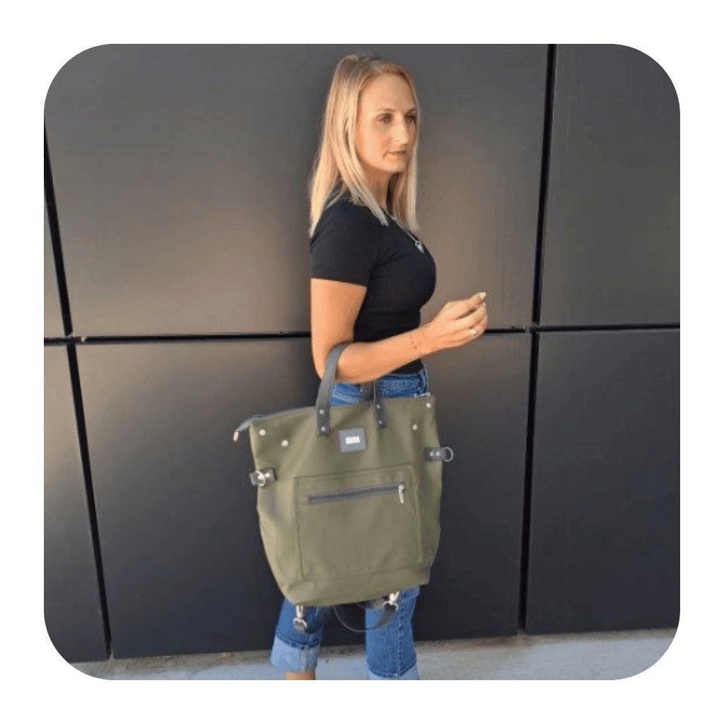 Střední módní taška vyrobená z olivové eko kůže. Uvnitř je silná bavlněná podšívka, a tři kapsy - dvě otevřené a jedna se uzavírá pomocí zipového uzávěru. Taška má pevný popruh. Je přidělána na čtyřech nýtech (uších) z kůže. Je možné ji nosit volně přes rameno nebo si nastavitelným popruhem ze stejného materiálu upravit tašku pro nošení diagonálně (crossbody).
