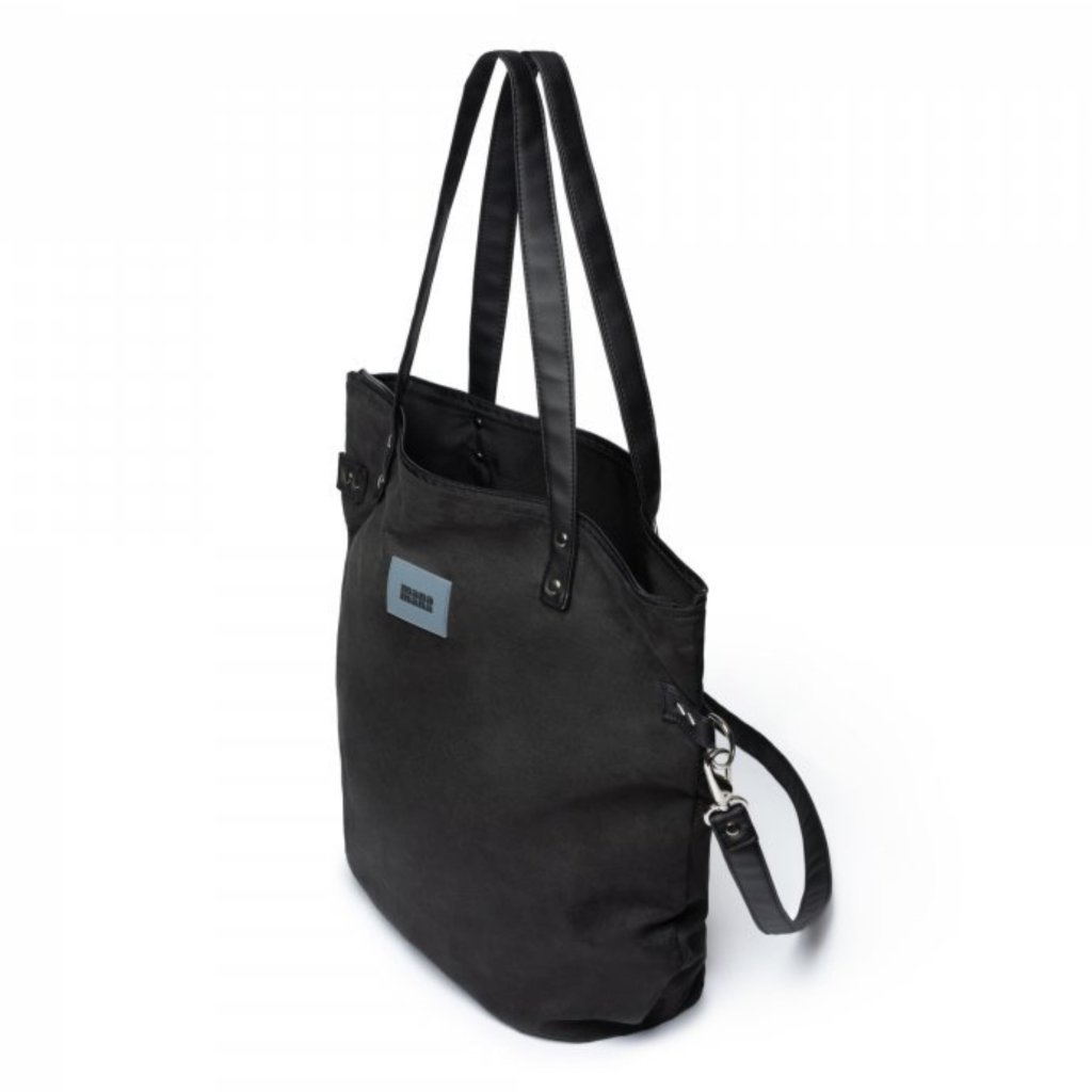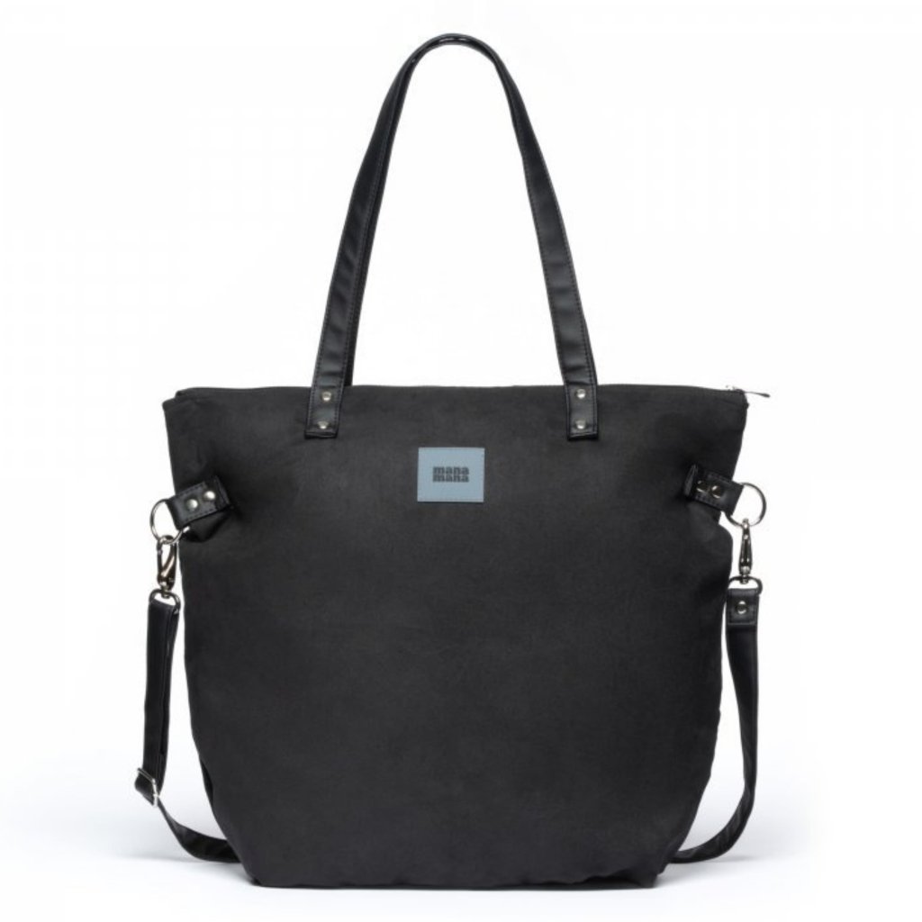 Velká taška z eko semiše v barvě černé. Uvnitř je silná bavlněná podšívka, a tři kapsy - dvě otevřené a jedna se uzavírá pomocí zipového uzávěru. Taška má pevný popruh. Je přidělána na čtyřech nýtech (uších) z eko-kůže. Je možné ji nosit volně přes rameno nebo si nastavitelným popruhem ze stejného materiálu upravit tašku pro nošení diagonálně (crossbody).