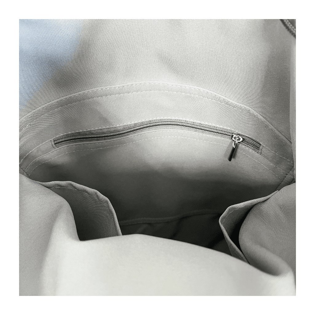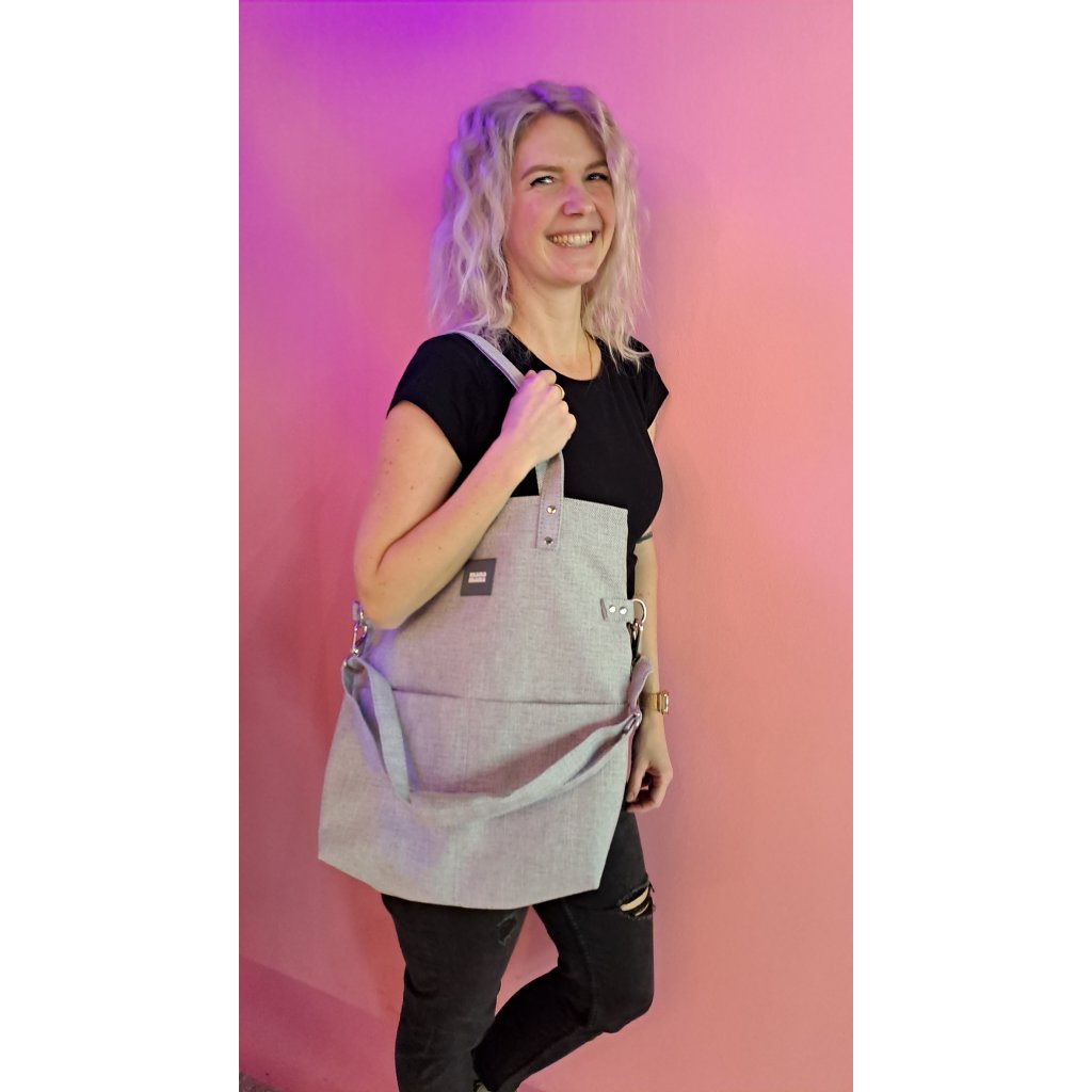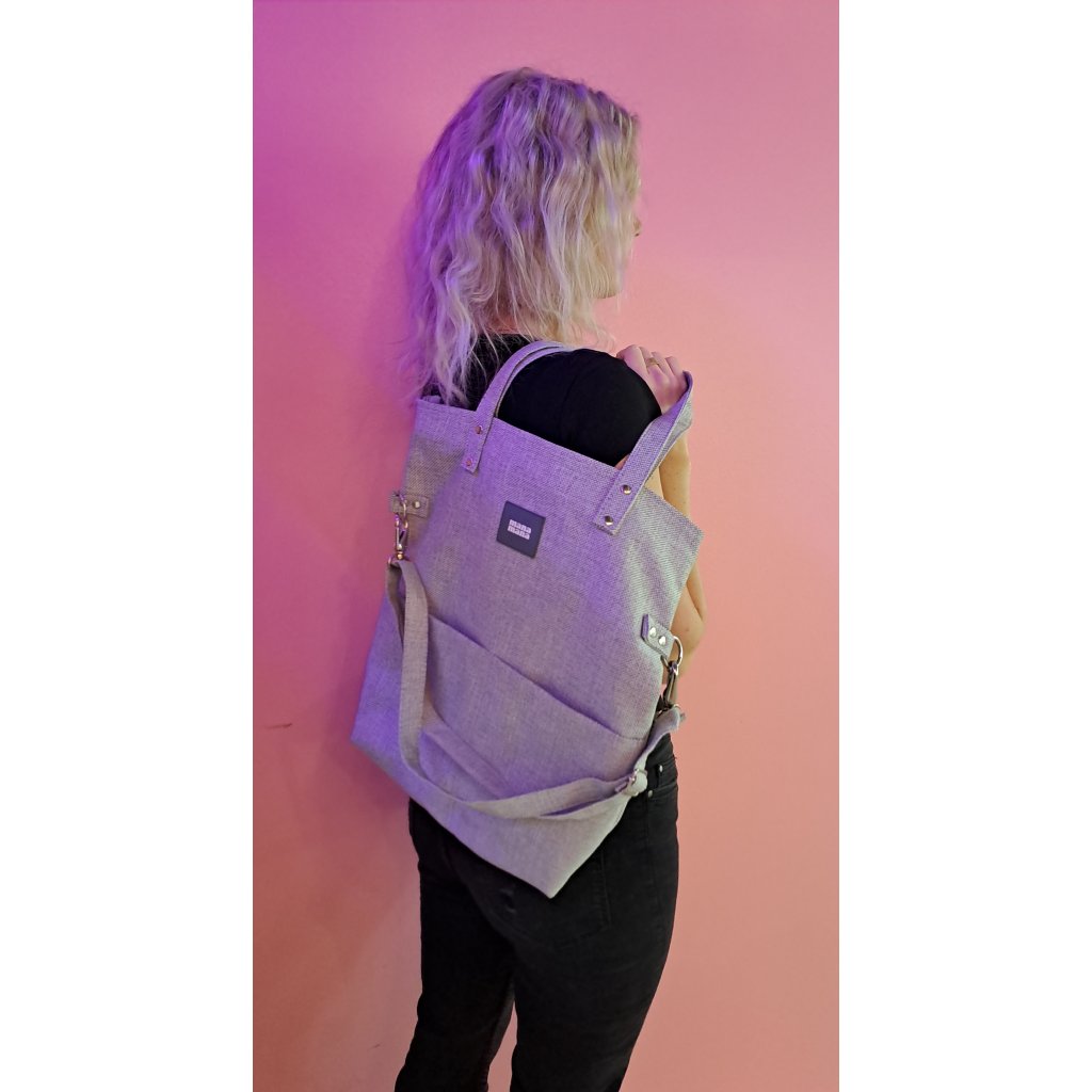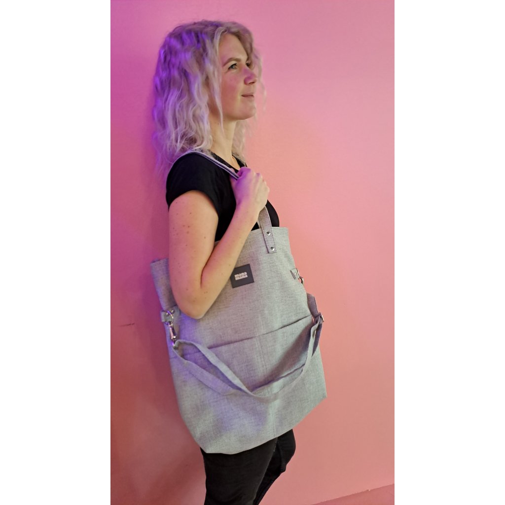 Střední módní kabelka vyrobená hrubé tkaniny v barvě šedé. Uvnitř je silná bavlněná podšívka, a tři kapsy - dvě otevřené a jedna se uzavírá pomocí zipového uzávěru.