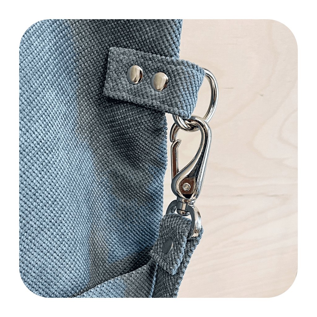 Kabelka má pevný popruh. Je přidělána na čtyřech nýtech (uších) ze stejného materiálu jako je taška.