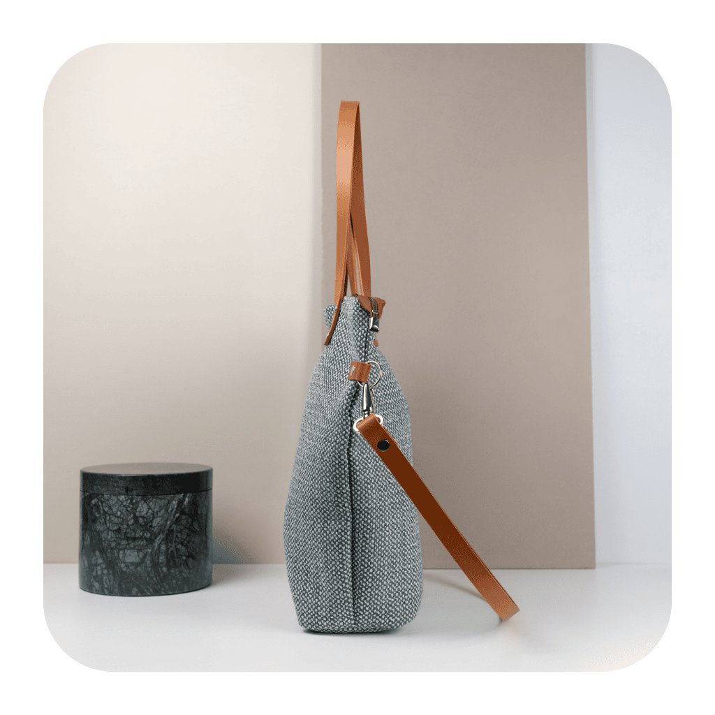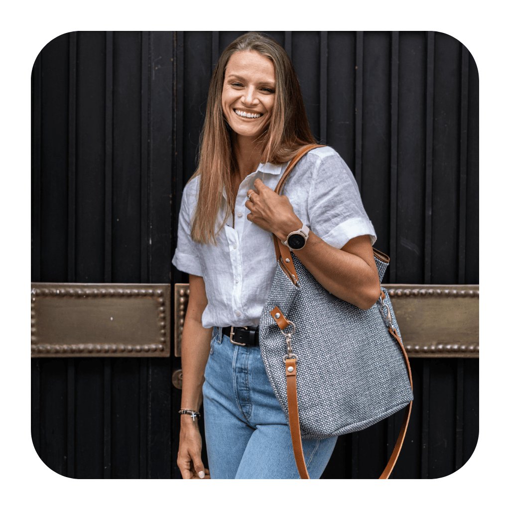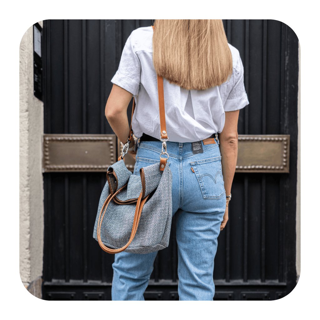 Pevný popruh a čtyři nýty (uši) z pravé kůže zajišťují nejen stabilitu, ale i pohodlí při nošení. Tašku můžete nosit volně přes rameno nebo si ji upravit pro nošení diagonálně (crossbody), což vám umožní mít volné ruce a pohodlí během celého dne.