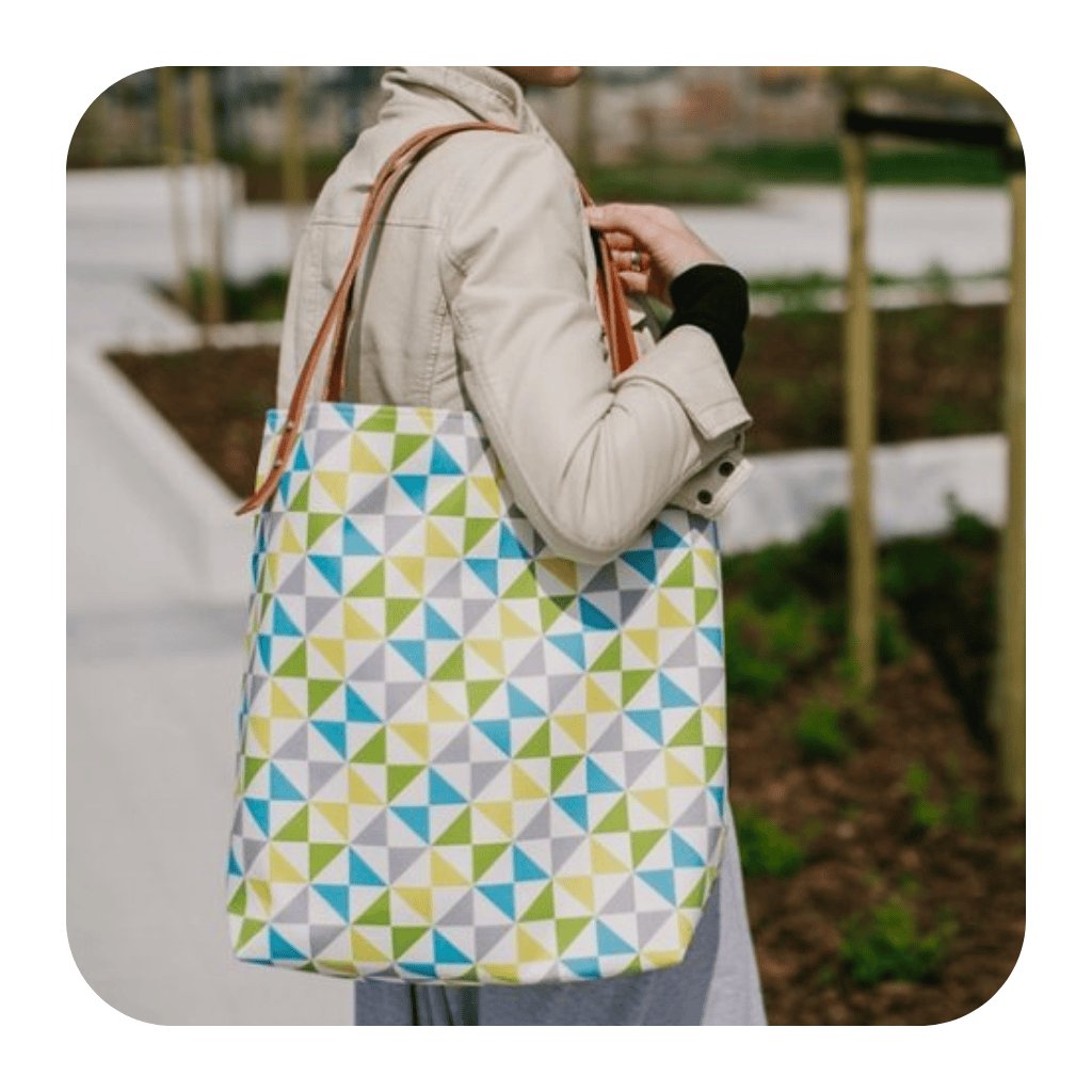 Velká taška z designově potištěné bavlny. Tkanina je impregnovaná a chráněná proti znečistění. Uvnitř jsou dvě kapsy - jedna otevřené a jedna se uzavírá pomocí zipového uzávěru.