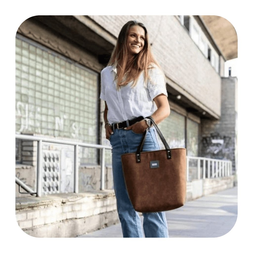 Velká módní taška vyrobená z eko kůže v barvě hnědé. Uvnitř je silná bavlněná podšívka, a tři kapsy - dvě otevřené a jedna se uzavírá pomocí zipového uzávěru. Je přidělána na čtyřech nýtech (uších). Je možné ji nosit volně přes rameno. Je měkká, pojme neuvěřitelné množství věcí a skvělá pro každodenní nošení do práce nebo školy. Taška pojme objem do 3kg (pro každodenní nošení), čas od času se může také přetížit na 5-6kilovou zátěž.