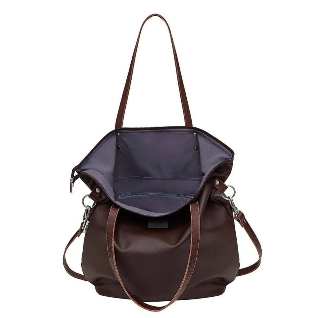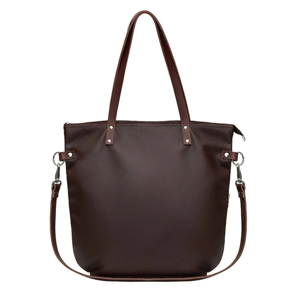 Velká módní taška vyrobená z eko kůže v barvě hnědé. Uvnitř je silná bavlněná podšívka, a tři kapsy - dvě otevřené a jedna se uzavírá pomocí zipového uzávěru. Taška má pevný popruh. Je přidělána na čtyřech nýtech (uších) z kůže. Je možné ji nosit volně přes rameno nebo popruhem pro nošení diagonálně (crossbody).