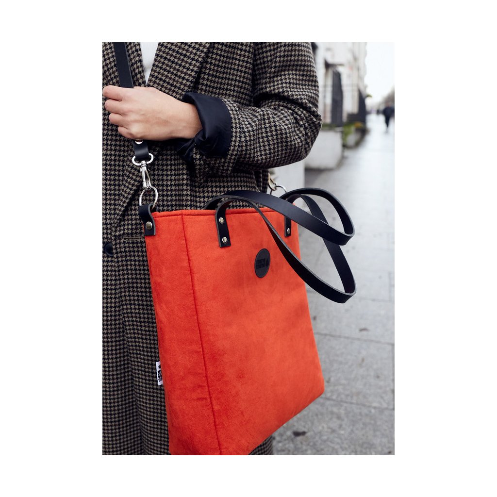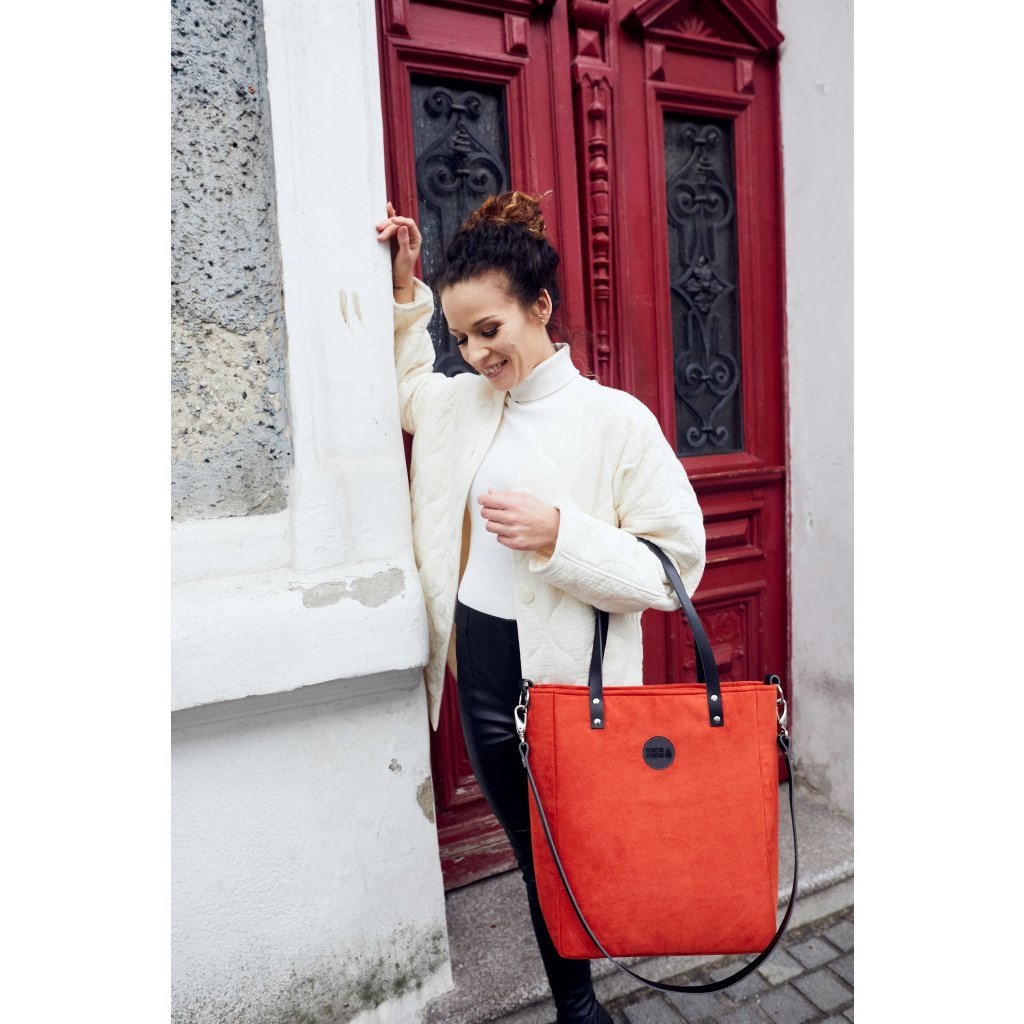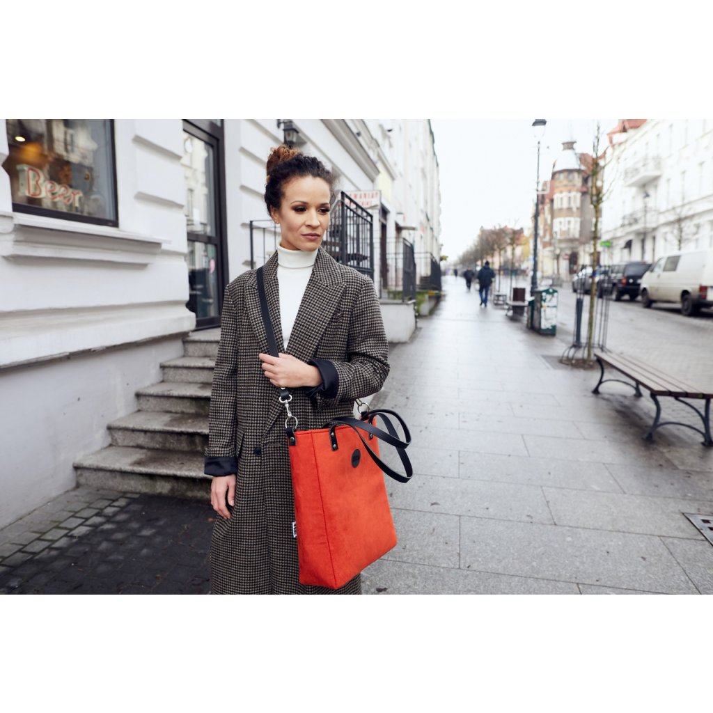 Minimalistická módní taška vyrobená z eko semiše v barvě rudé. Uvnitř je silná bavlněná podšívka, a tři kapsy - dvě otevřené a jedna se uzavírá pomocí zipového uzávěru. Taška má pevný popruh z krásné kůže. Je přidělána na čtyřech nýtech (uších). Je možné ji nosit volně přes rameno nebo si nastavitelným popruhem ze stejného materiálu upravit tašku pro nošení diagonálně (crossbody).