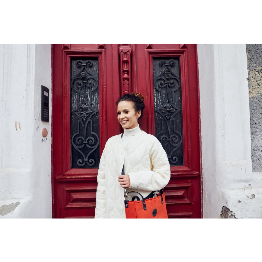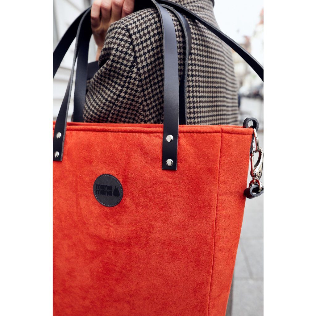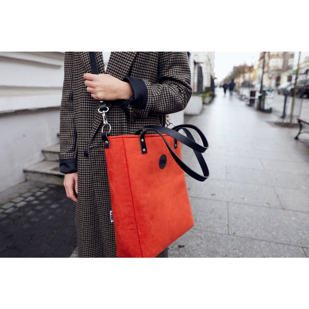 Minimalistická módní taška vyrobená z eko semiše v barvě rudé. Uvnitř je silná bavlněná podšívka, a tři kapsy - dvě otevřené a jedna se uzavírá pomocí zipového uzávěru. Taška má pevný popruh z krásné kůže. Je přidělána na čtyřech nýtech (uších). Je možné ji nosit volně přes rameno nebo si nastavitelným popruhem ze stejného materiálu upravit tašku pro nošení diagonálně (crossbody).