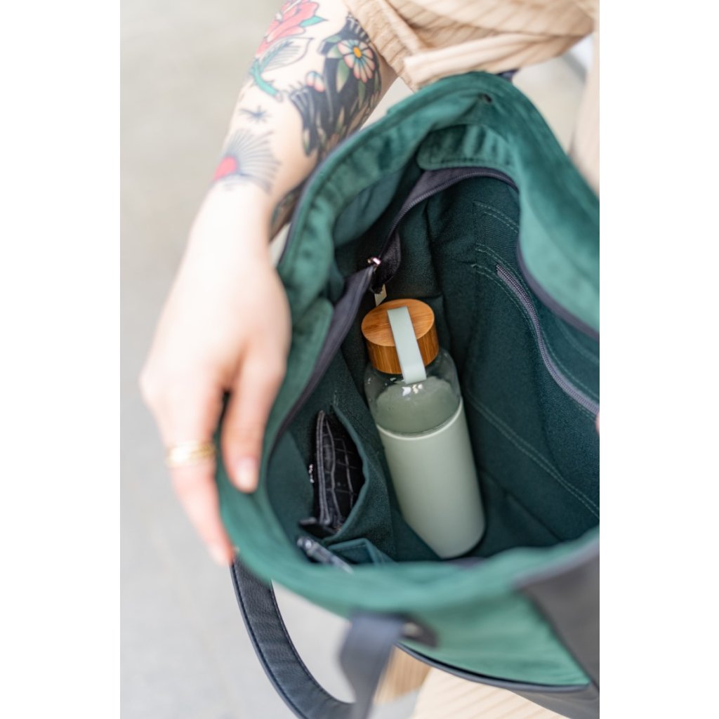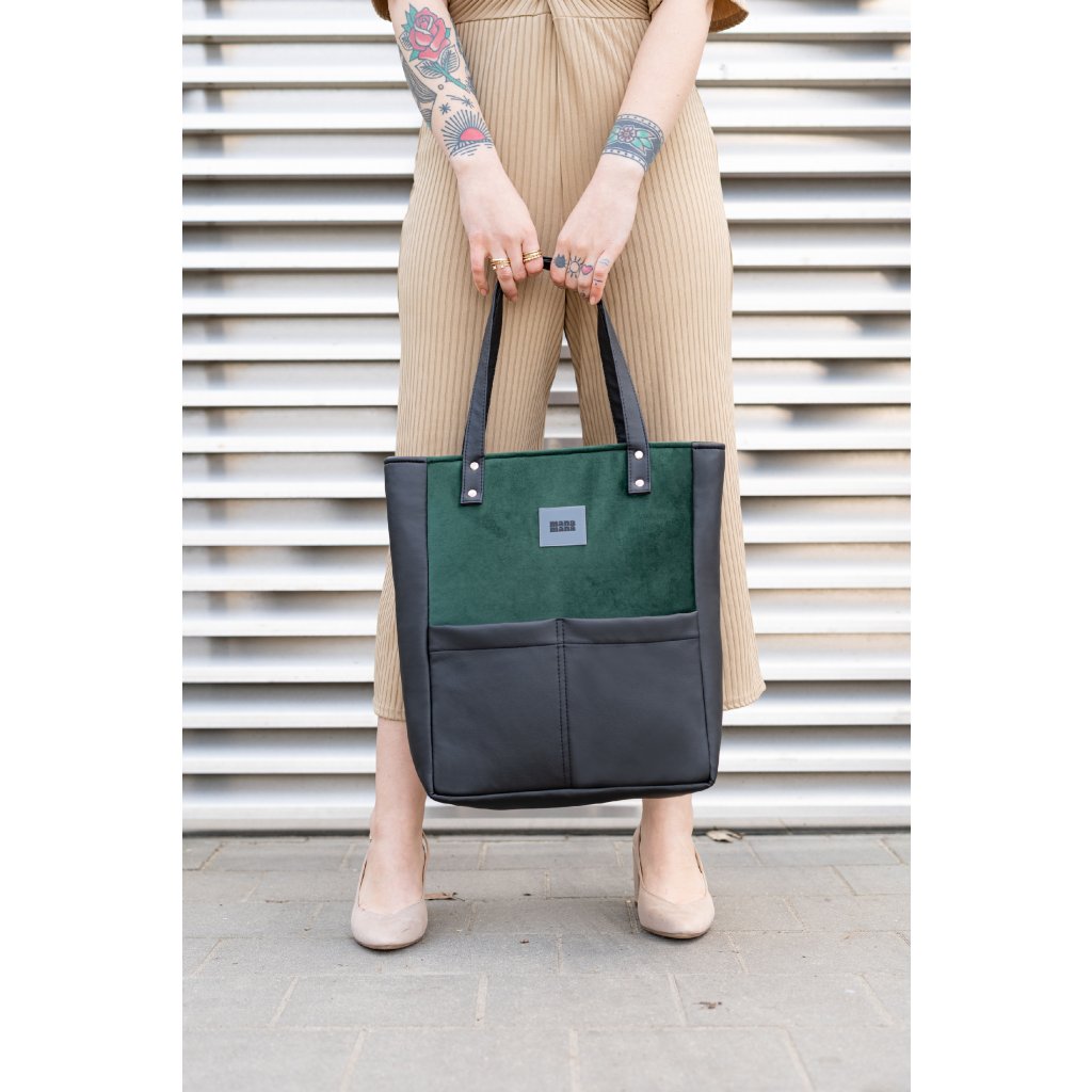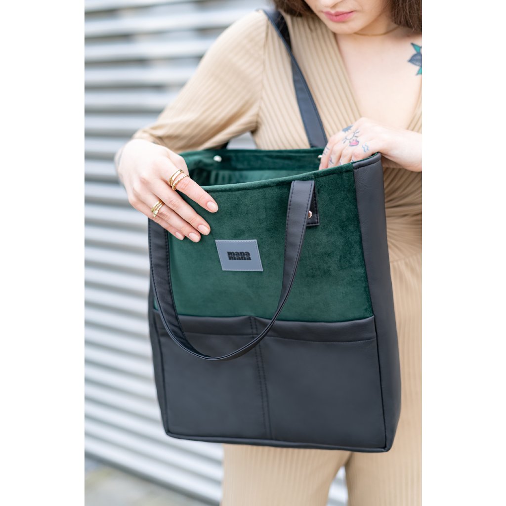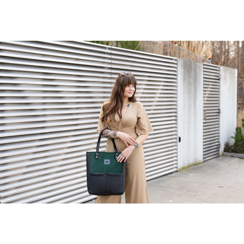 Velká taška ze zeleného eko semiše a černé eko kůže. Uvnitř je silná bavlněná podšívka, a tři kapsy - dvě otevřené a jedna se uzavírá pomocí zipového uzávěru. Taška má pevný popruh. Je přidělána na čtyřech nýtech (uších) z eko kůže. Je možné ji nosit volně přes rameno nebo v ruce.