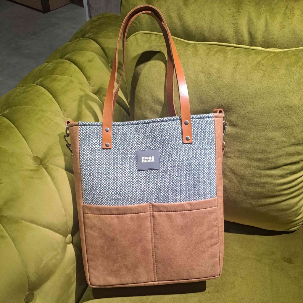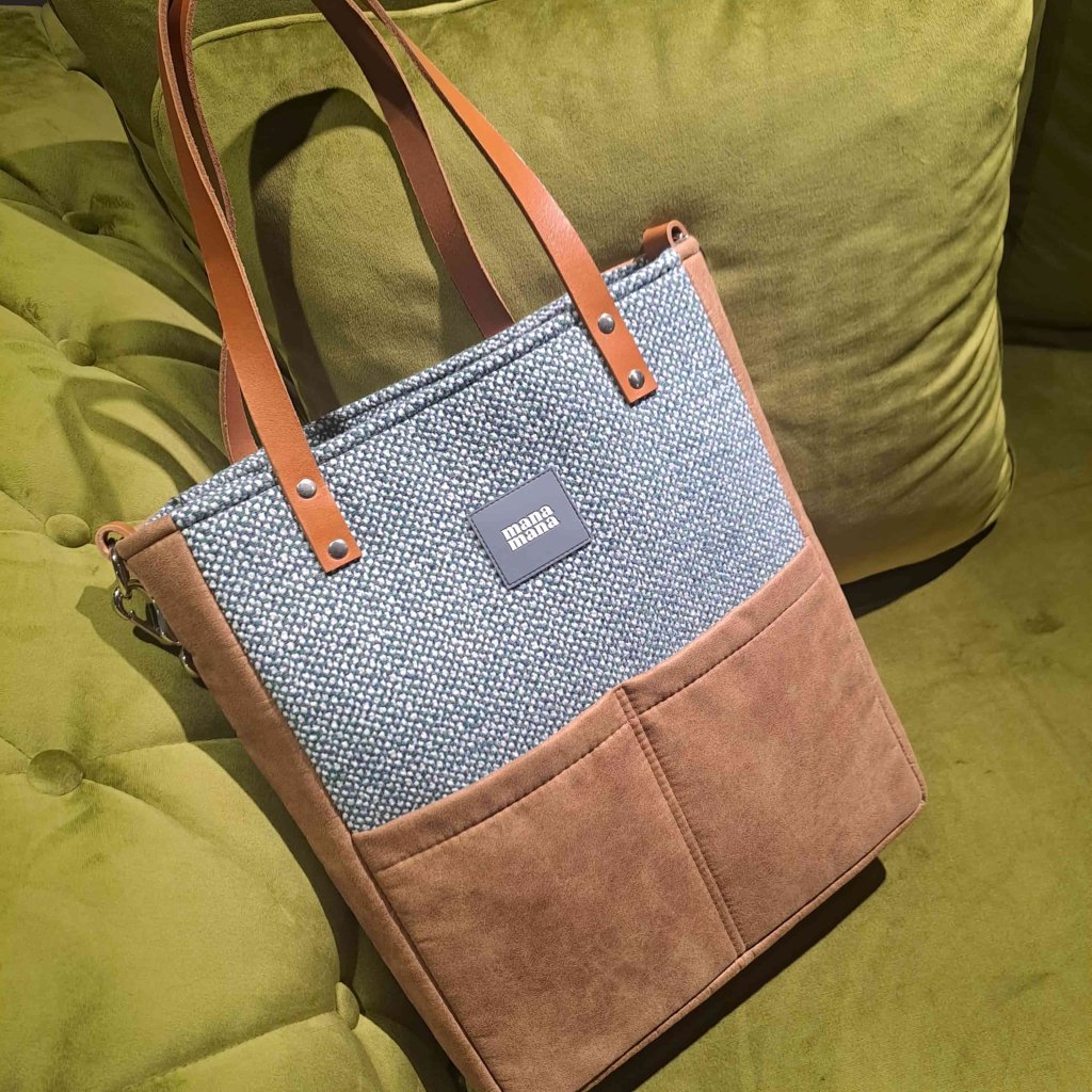 Minimalistická módní taška vyrobená z hrubé tkaniny v barvě zelenomodré doplněná o prvky z pravé kůže karamelové.
