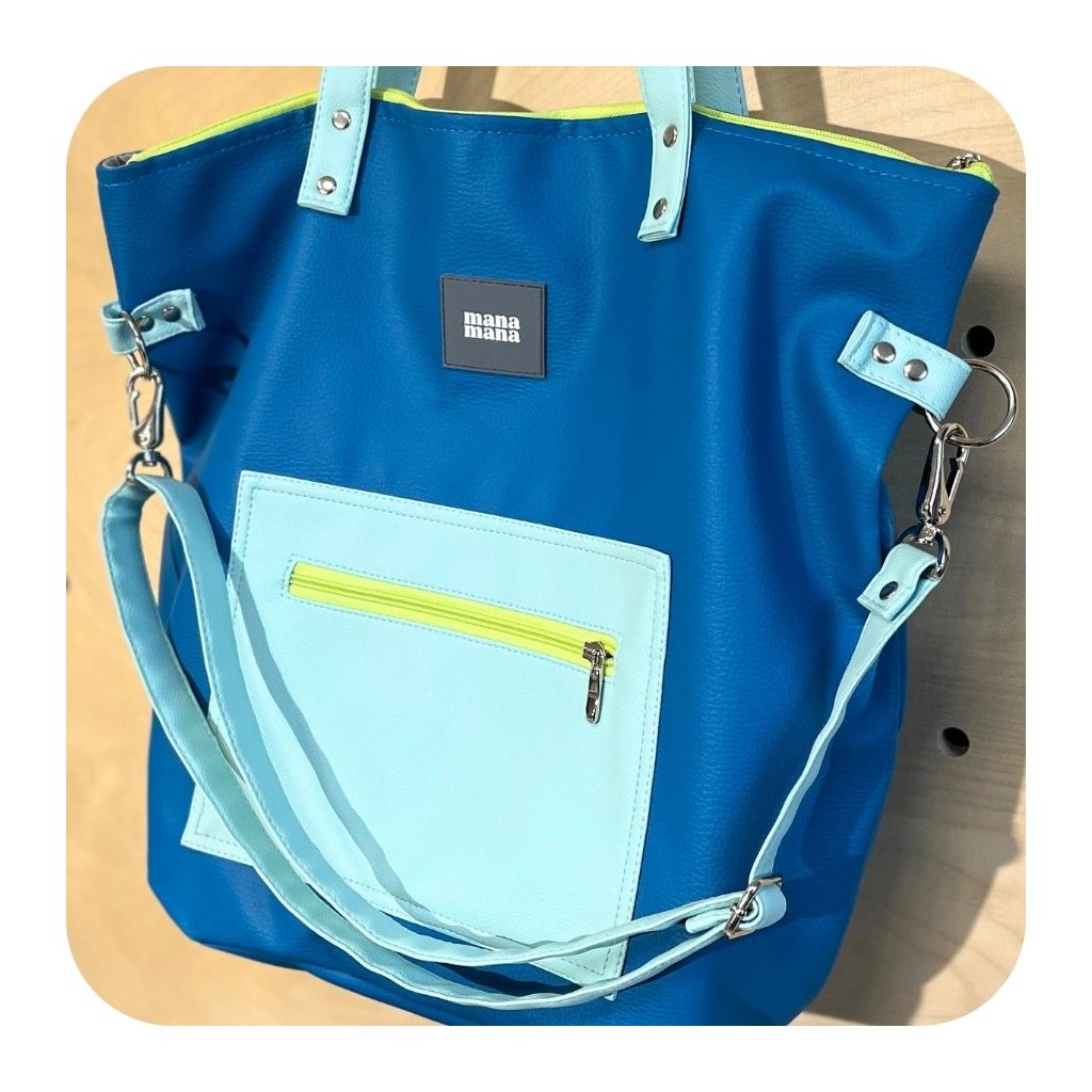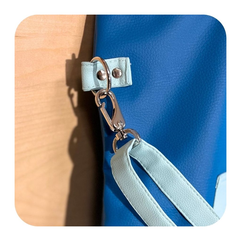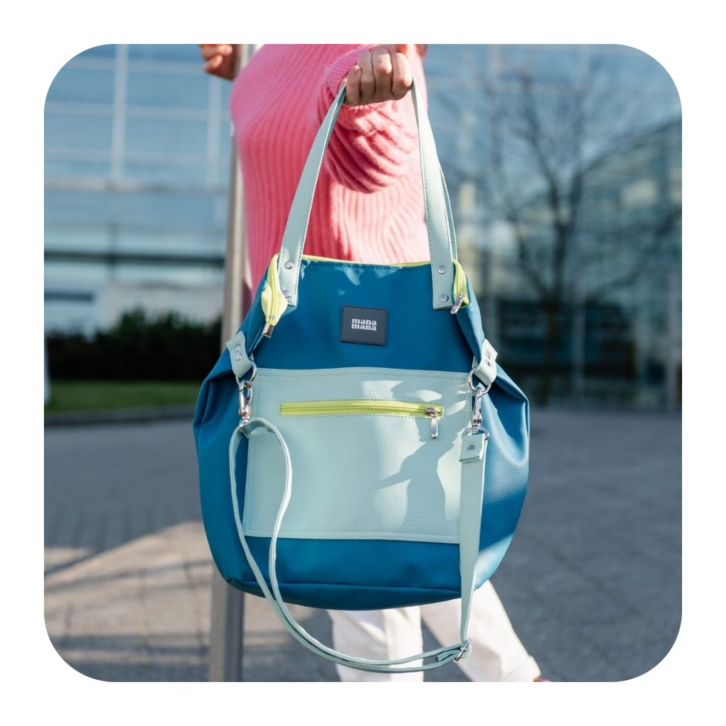 Velká kabelka z eko kůže v modré barvě s mátovými doplňky.