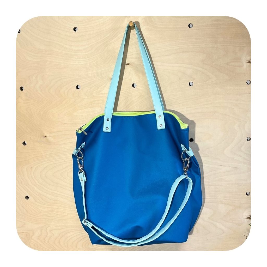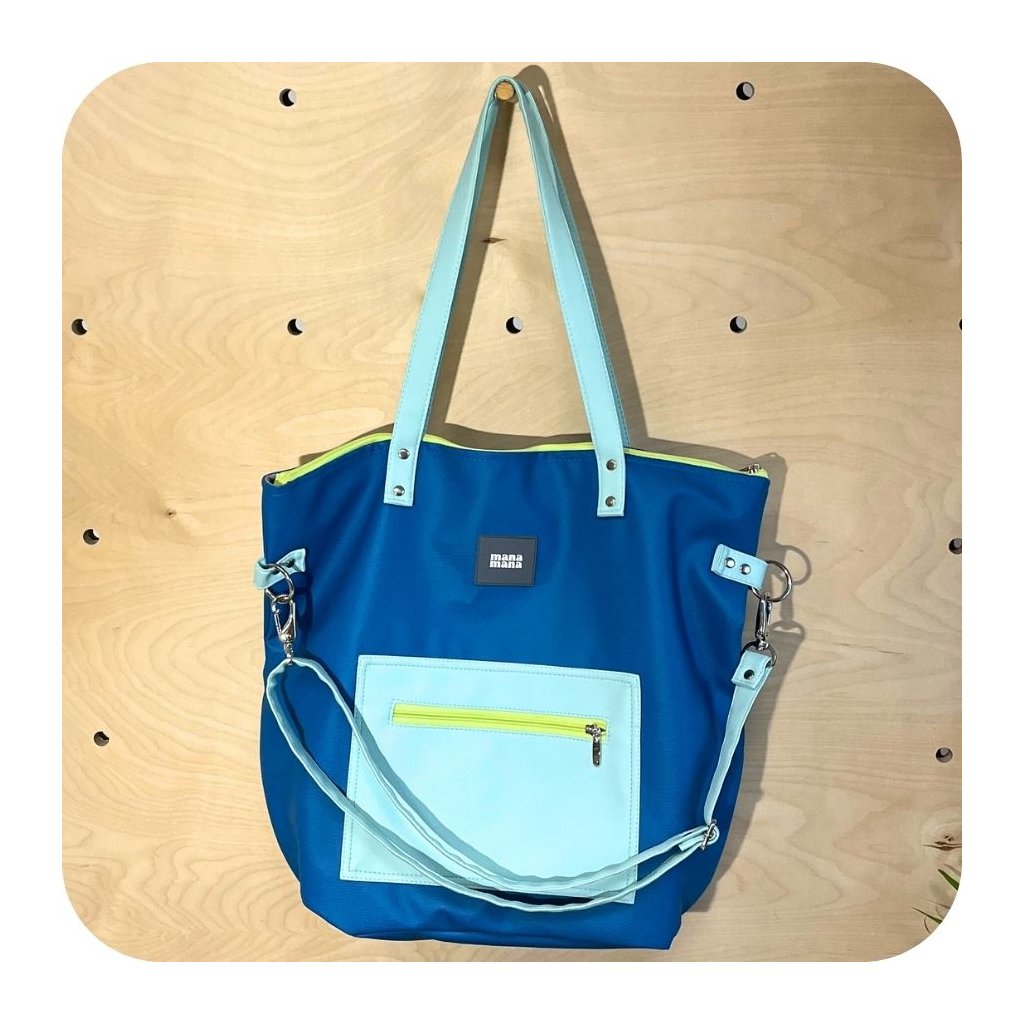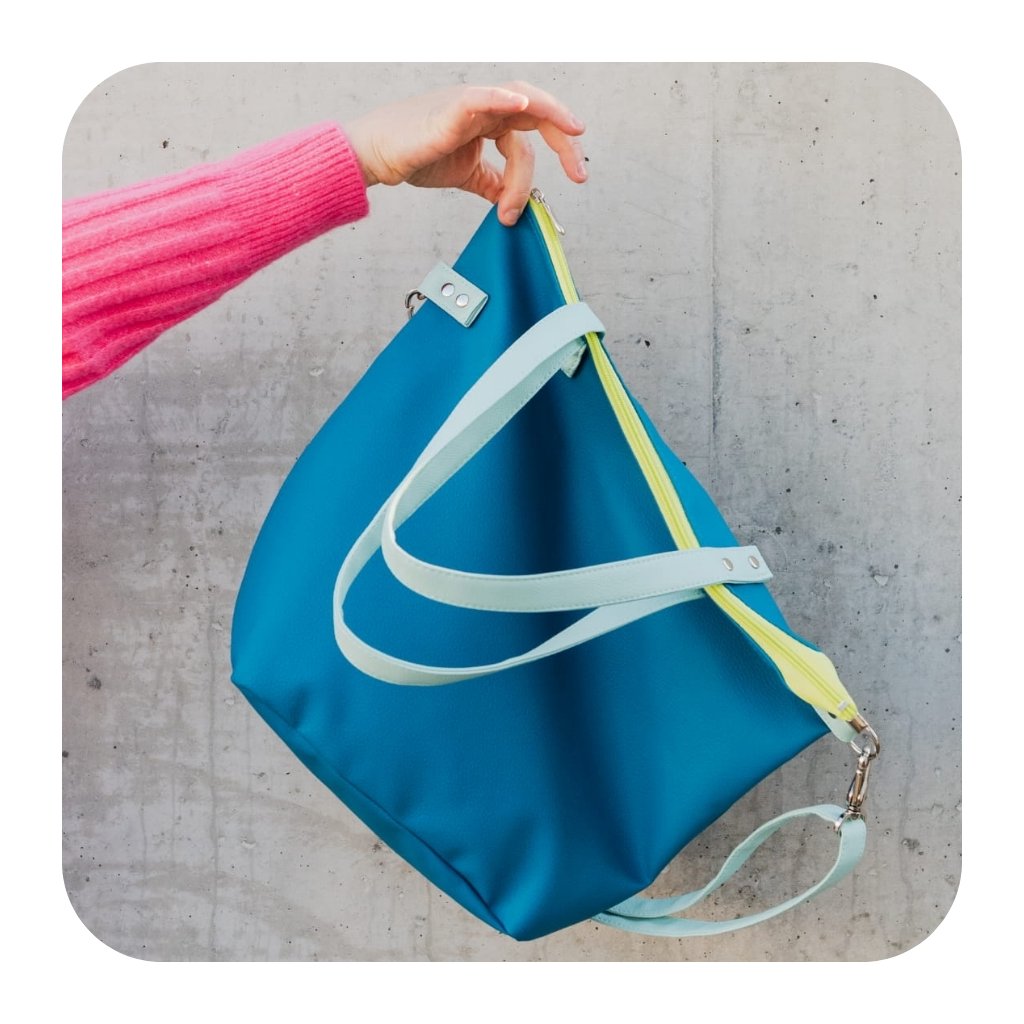 Velká kabelka z eko kůže v modré barvě s mátovými doplňky.